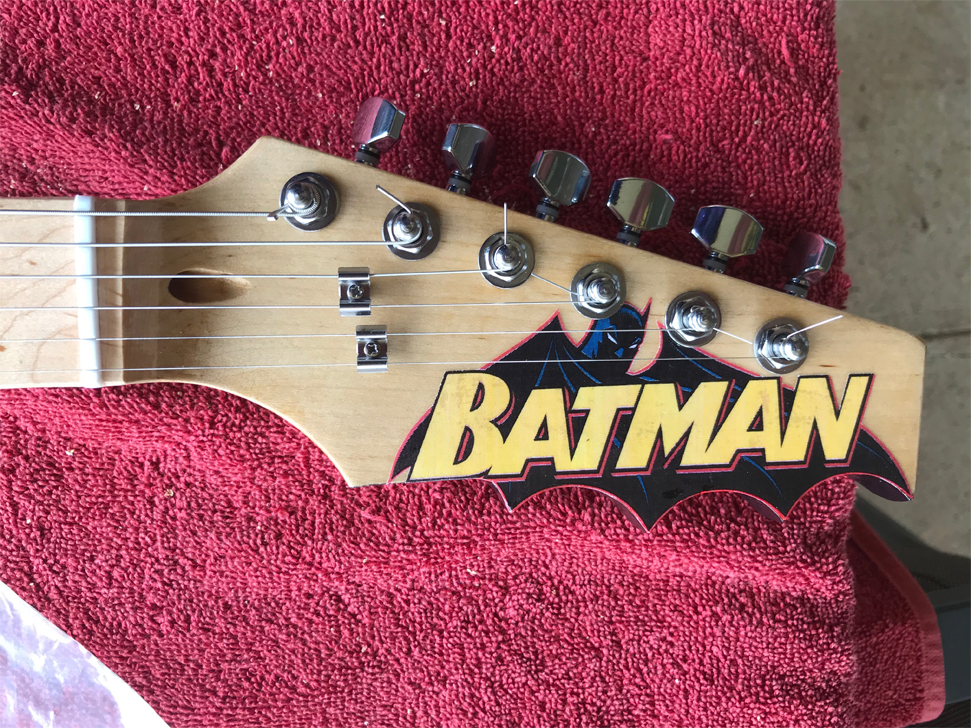 Finished my Bat Strat today. It’s my first build. Upgraded the pickups to s-s-h configuration but that’s about it. Cut up some Batman comics to cover the front of the body then glossed the hell out of it. Cut the headstock to fit the logo.