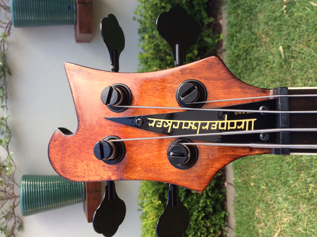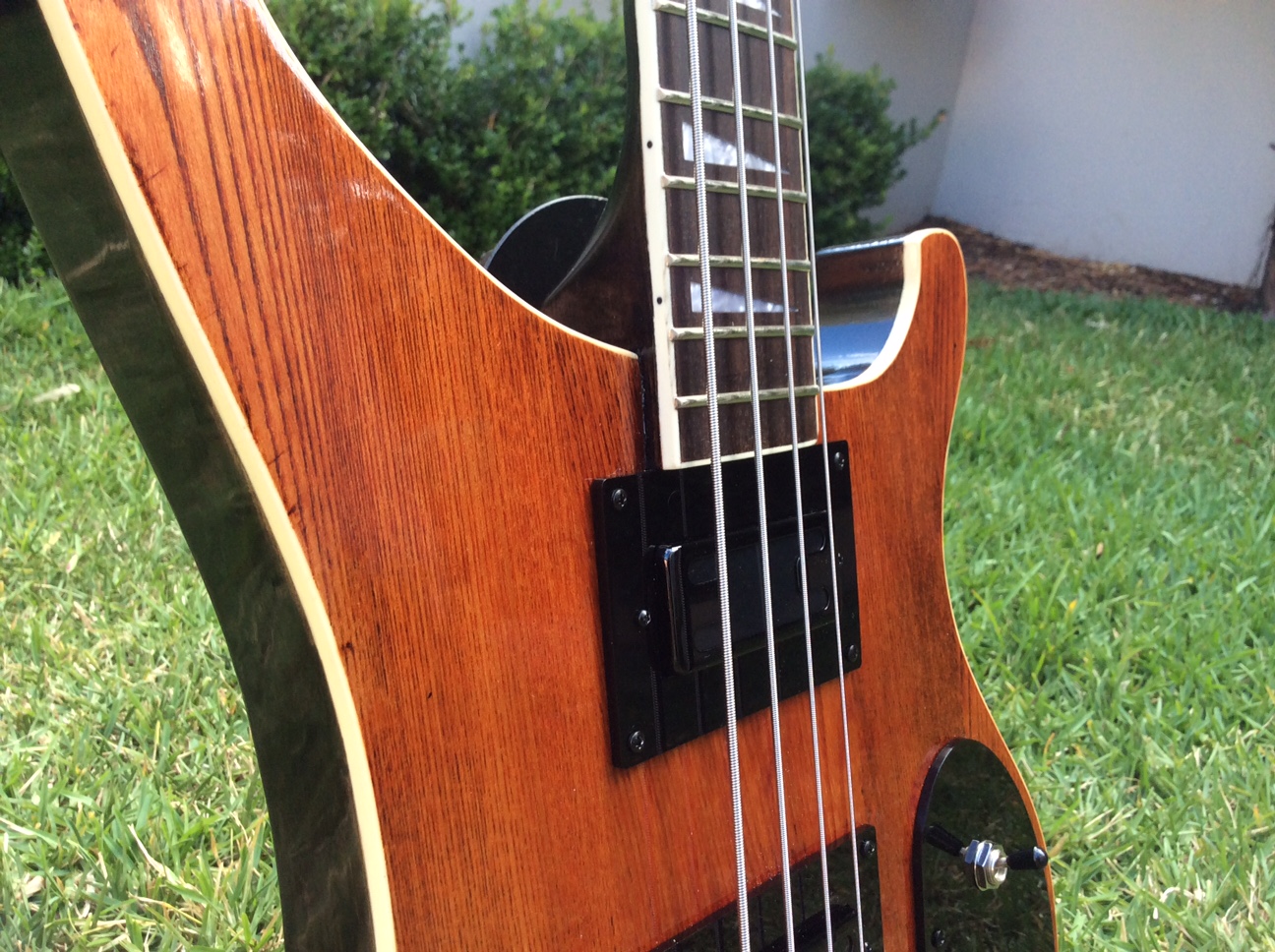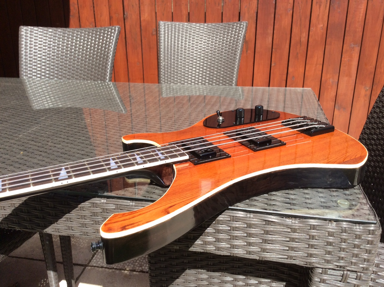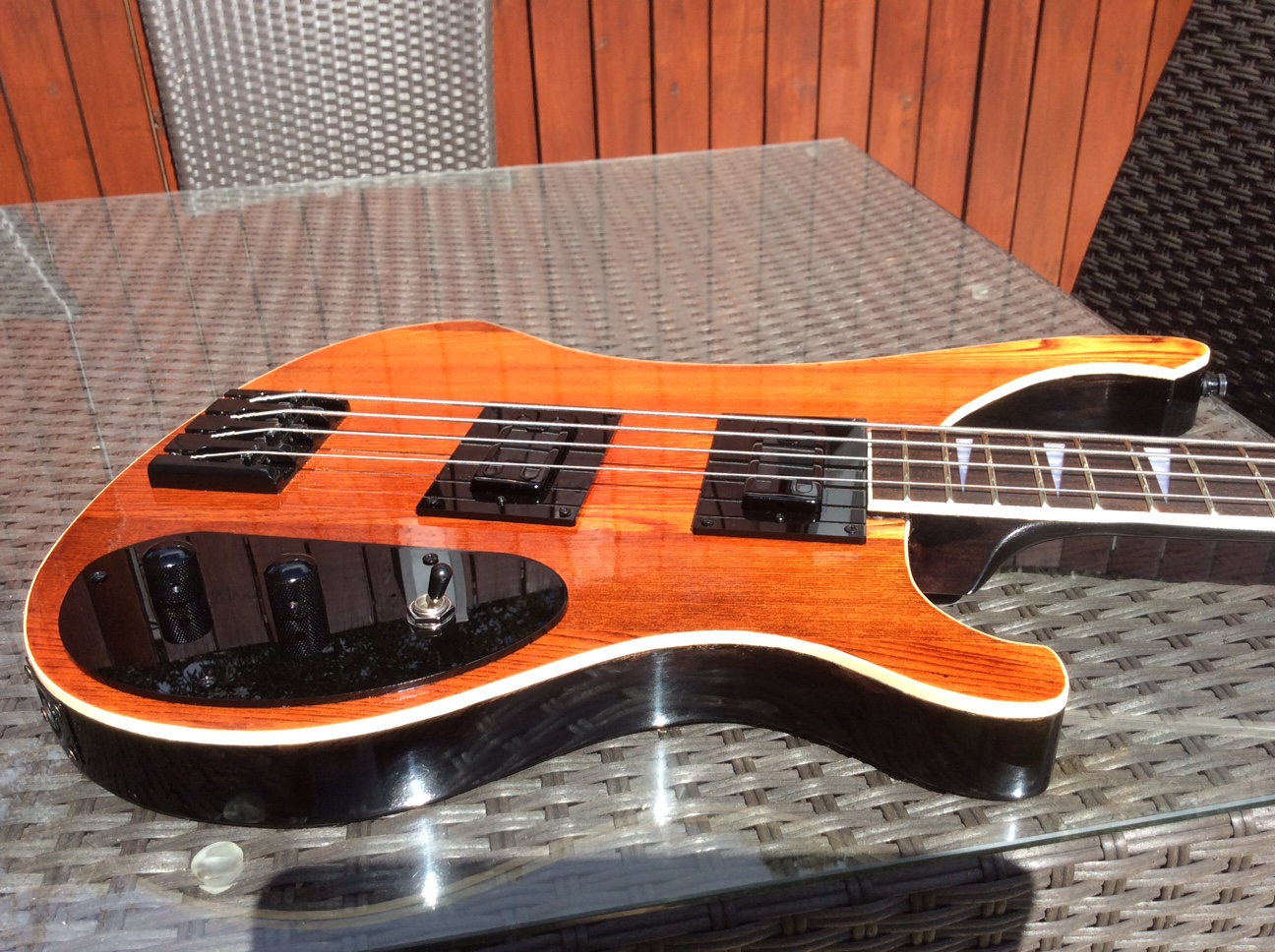 RC4A adapted to double humbuckers. Laser cut pickup mounts and control cover. Wired for one vol and one tone as 4004. Feast Watson Jarrah stain and Black stain, Cabothane clear polyurethane clear coat.