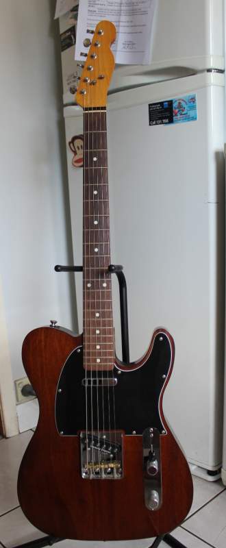 I'm Joe, and have decided to build up another guitar. The first guitar I built up was a telescaster. While this guitar was not a kit guitar I did buy all the parts for it and put her together. The Body was made out of Mahogany with double binding by guitar builder down in Melbourne. the neck is a Allparts Vintage radius neck and the pick ups are Seymour Duncan Quarter Pound for Tele, and gives it a warm sound and the wiring is out of a USA made tele.
