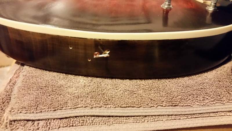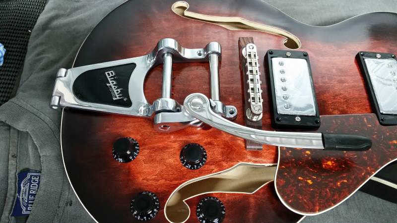 Changed bridge for a Bigsby aluminium one because the action was too high and I mangled the wood base trying to get it low enough, other option was to unglue and shim the neck.