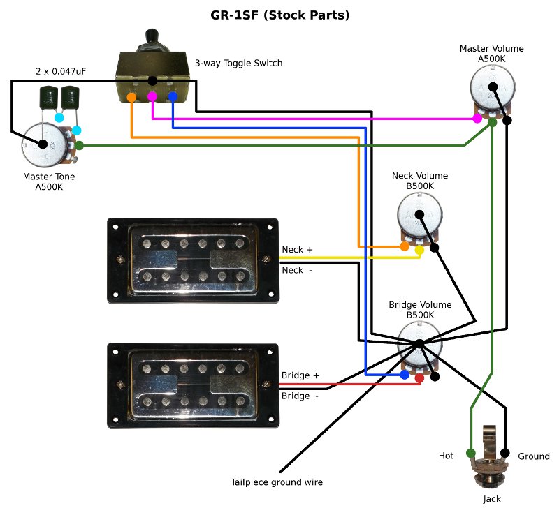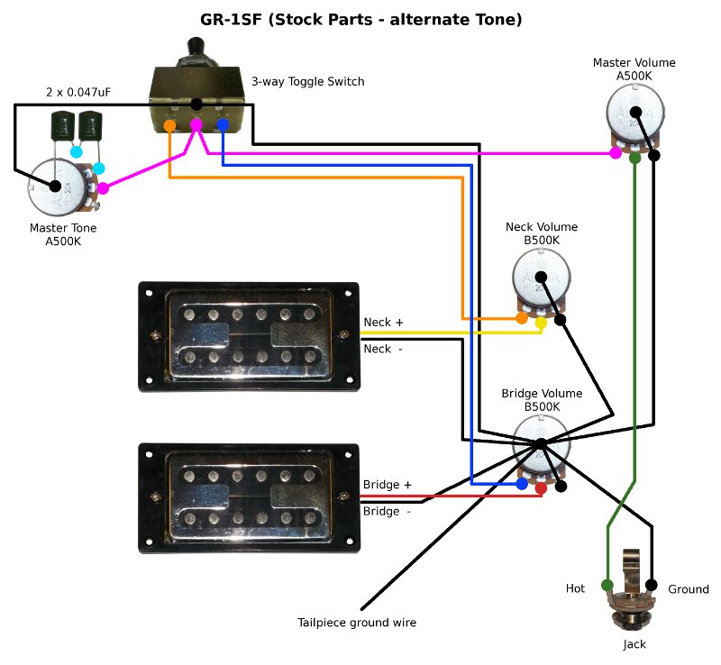Note: All of the following diagrams are wired with tone connections on the 'in' lug of the volume pot (modern style), rather than on the 'out' lug of the traditional schematics (easy to change if needed).