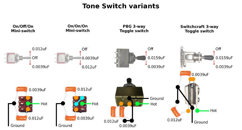 If you want to try a tone switch, you can actually do it will On/Off/On or On/On/On mini-switches, or even standard 3-way toggle switches: