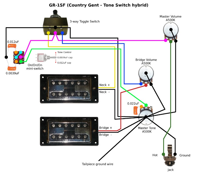 If you're willing to add a few more extra parts you can combine a couple of the traditional schematics into some interesting designs. The Gentleman who lives in the Country style layout has a master tone and bridge volume, but if you add an On/On/On mini-switch you can also have tone switch options. A CG tone switch hybrid: