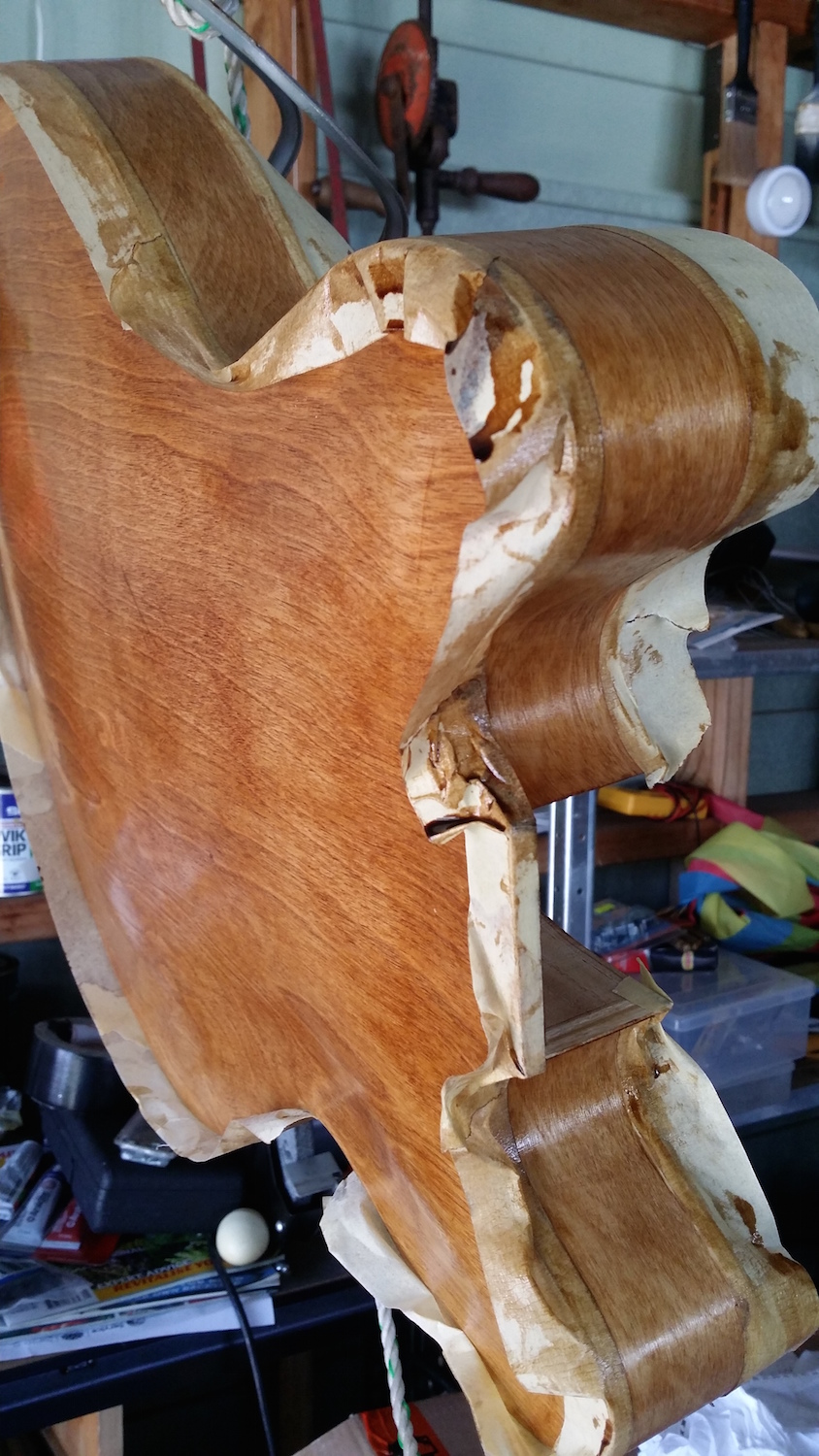 After a quick sand all over with 320 grit, here's the first coat of stain and varnish hanging up to dry.