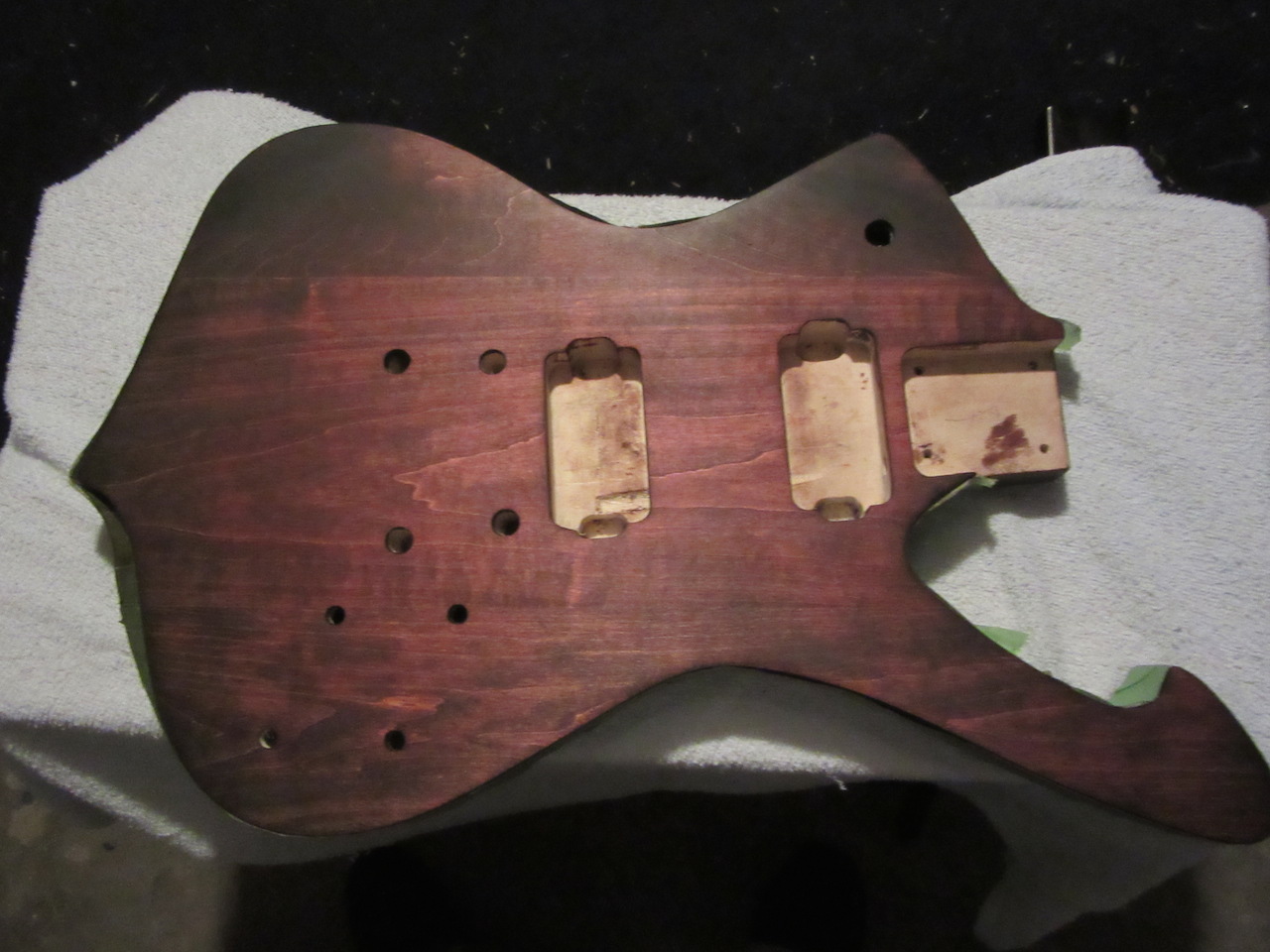 Sanded the face of the body with 220 grit sandpaper. Was careful not to hit the edges very much. Wanted to scuff off the middle for my planned sunburst pattern. First off, went to 6 different hardware store. None of them had Black Cherry. The only colour close to my choice was Cabernet from Varathane. So I bought the cabernet and began staining. When wet, it had the colour I wanted, but when I wiped it off it was very weak and thin.