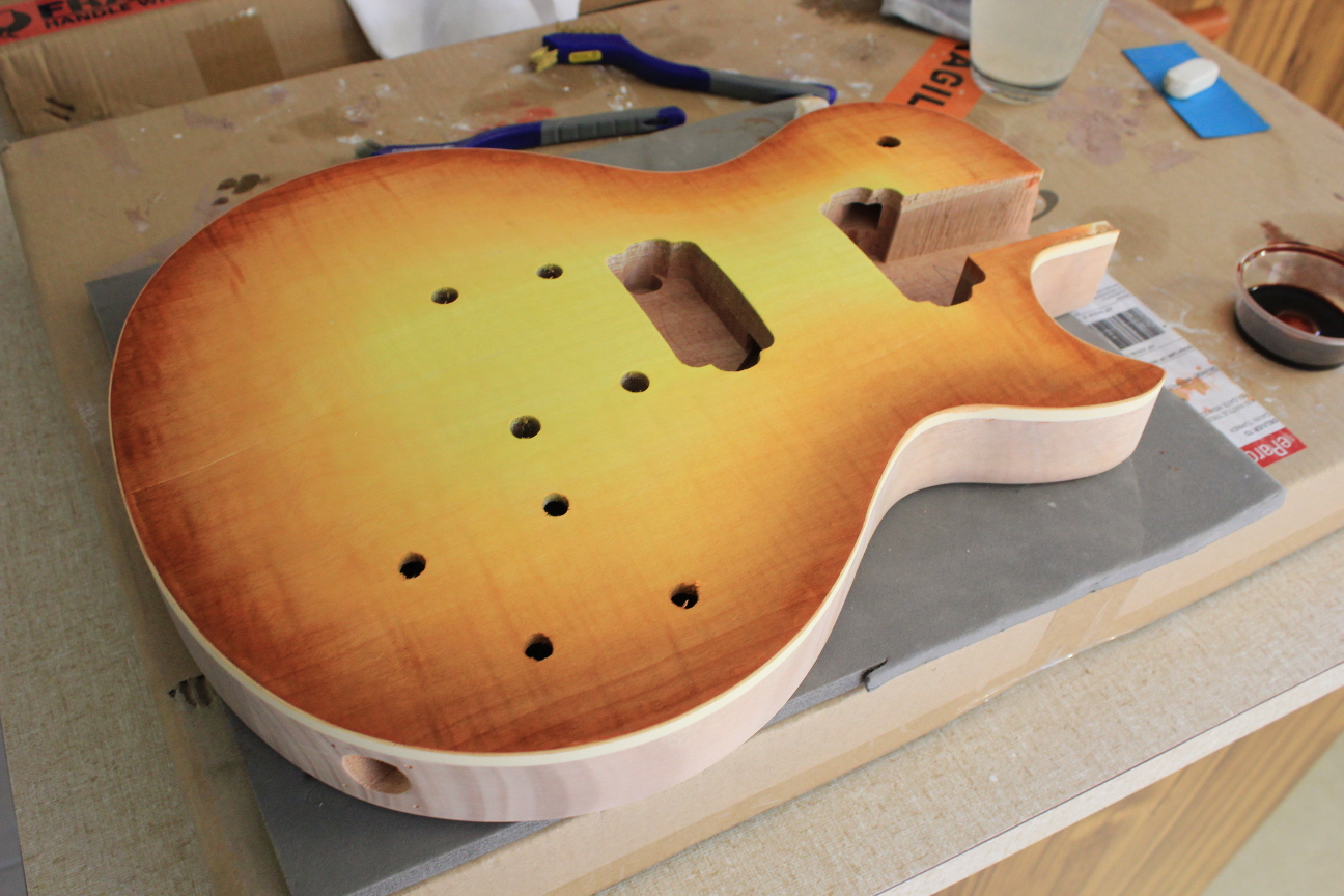 I just did an LP flame maple burst with my Colortone dyes. When I started no glue spots were apparent with either an initial water wipe or with the first colour (lemon yellow). However as the subsequent colours went on, glue spots magically appeared in the top. Bummer. Is there a technique to work on the glue spots so that I can save my burst? Maybe the wire brush trick? What process would you recommend? Any help you can give me would be greatly appreciated. I've never had this happen before.