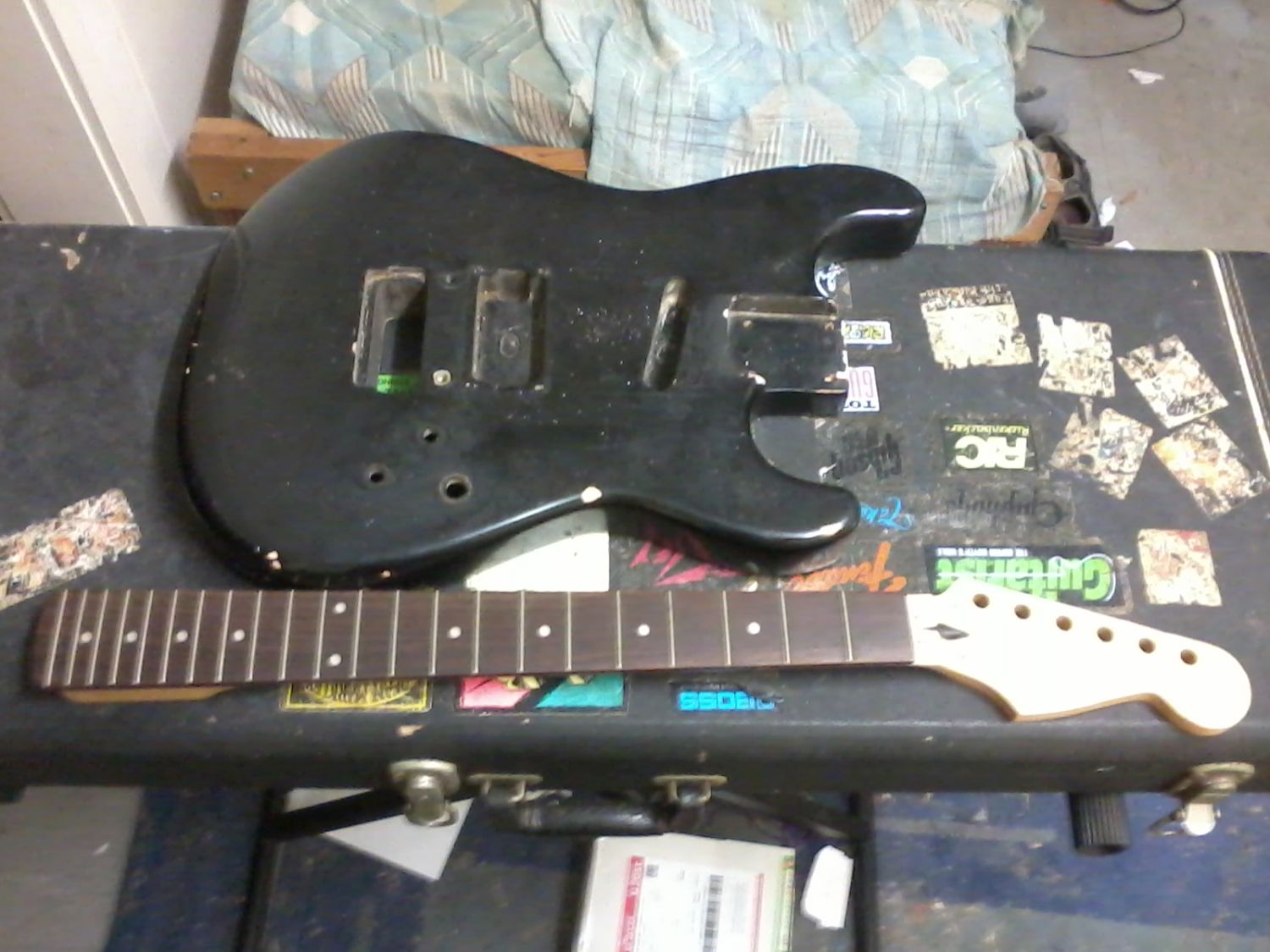 I just remembered that I had a guitar body and neck amongst all my stuff, the neck is a Mighty Mite 22 Fret Strat-style neck I bought online as a replacement for the neck on my Mexican Fender Strat but ended up not using, it has been routed to accept a Floyd Rose Locking Nut.