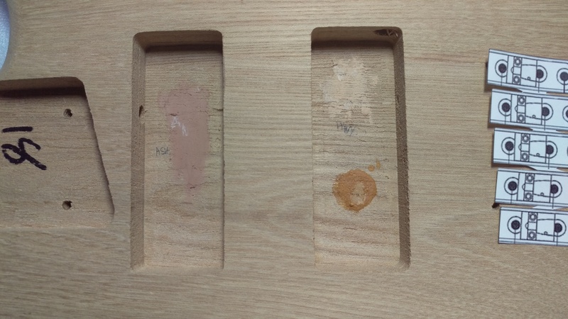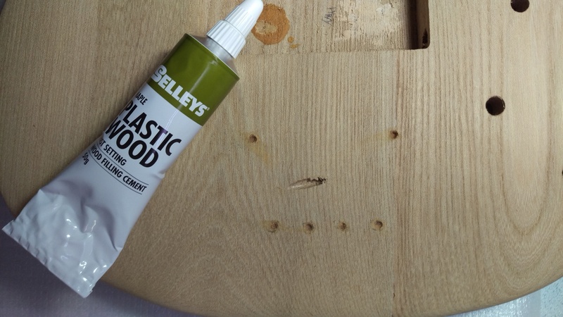 So anyway, first job was to fill in the holes that had been pre-drilled for the bridge that came with the kit. I tried a few different options: timbermate Ash on the left, timbermate hardwood top right, and plastic wood bottom right.