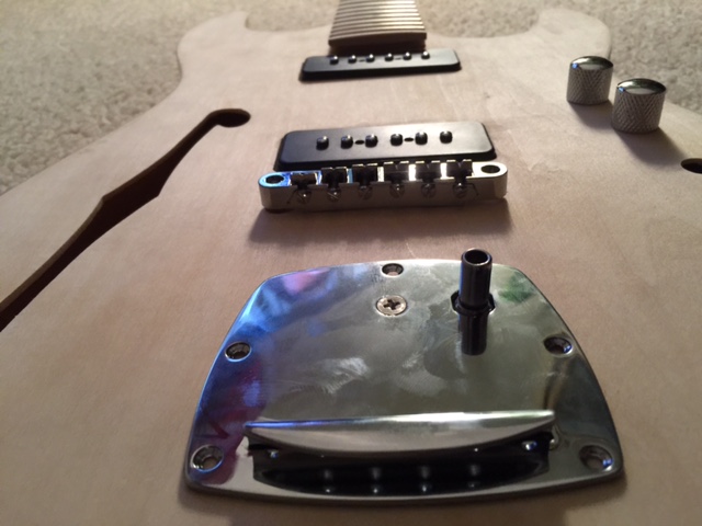 Hi again, here are the pics. This will show the tail piece and tremolo (I'm assuming it goes this way. Flip it and the tremolo sits at the top of the strings. Also you can see how sweet the P90's sit in their cavity but I'll need to check how to keep them in there as there are no screws etc unless there is a pickup frame I can slot in.
