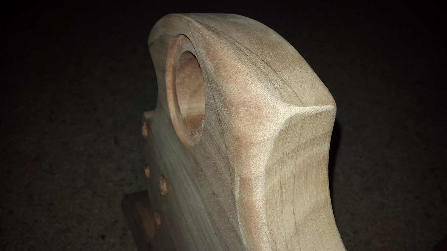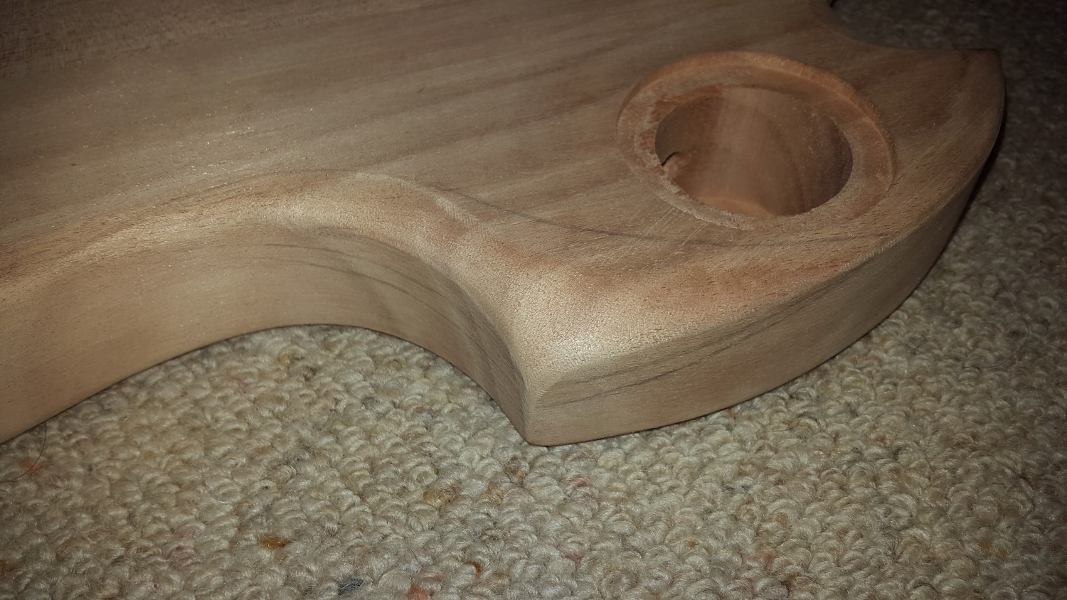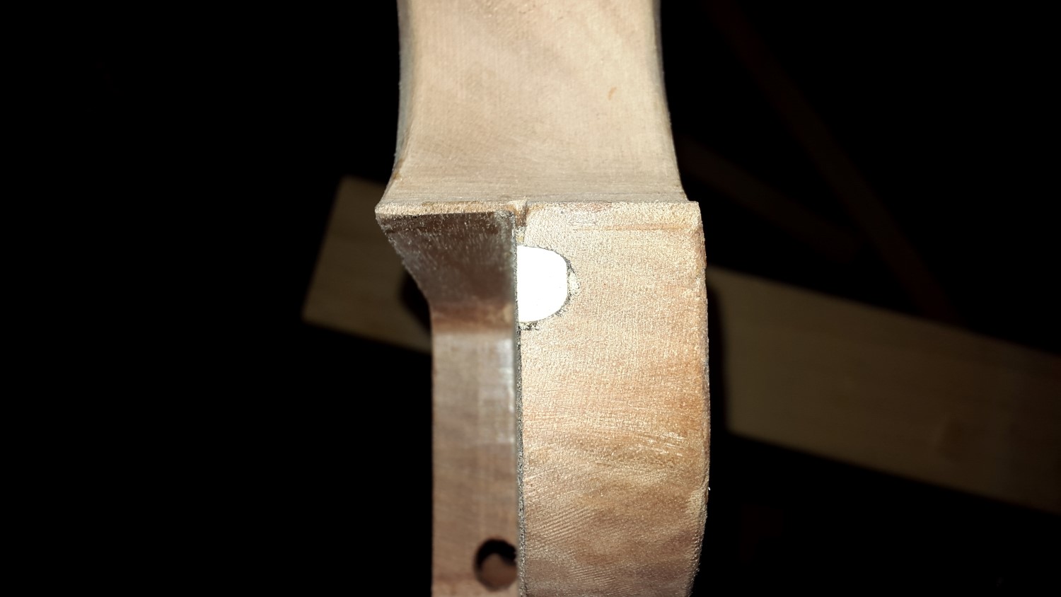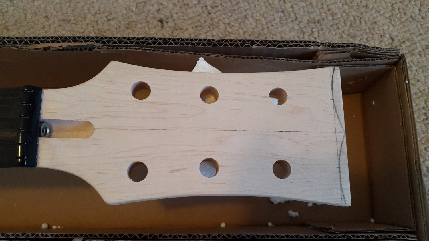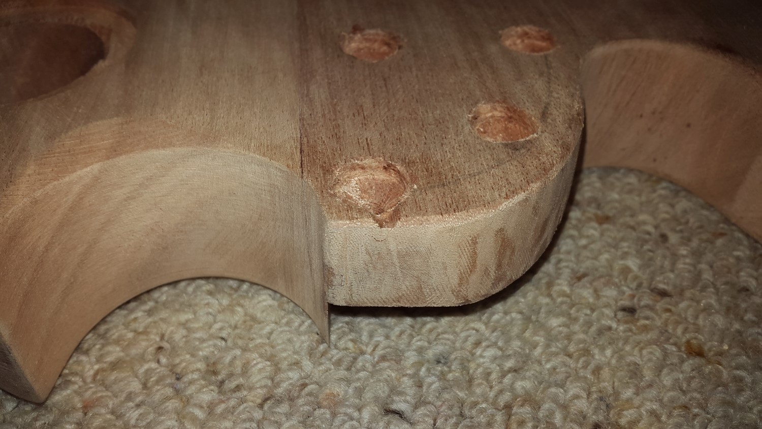 This all happened a couple of days ago, but I hadn't taken pics and stuff: I drilled the wider holes for my neck ferrules in, but the holes ended up pretty sloppy, had a tapered bottom (on accounts of using a wrong sort of drill bit), and the top-side hole was too close to the edge and chipped off a bit too (I found that chip though, so I'll be able to glue it back in.) I'm definitely filling in that hole completely and moving it in from the edge, but I'll just fill the tops in from the other holes.