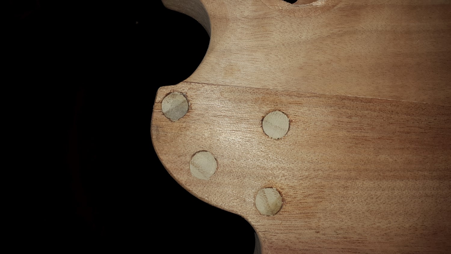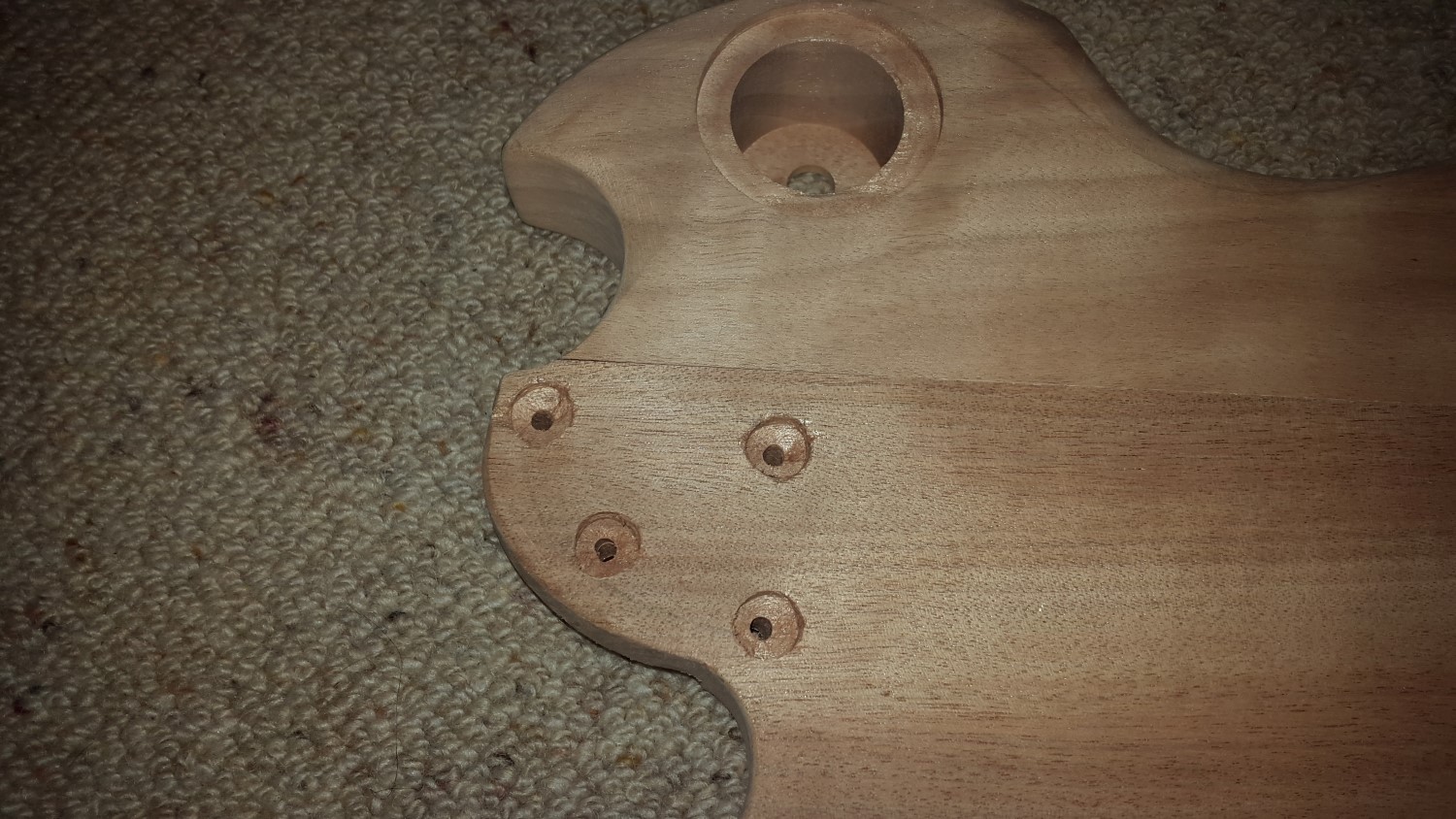 I also had some mishaps with filling the neck screw holes. I ended up ripping a pretty big chunk out of the neck join, so I've had another part to fill back in. I also had to drill the larger holes all the way through in order to fill them out and drill them back right. Had no problems with the pot hole, so smooth sailing there.