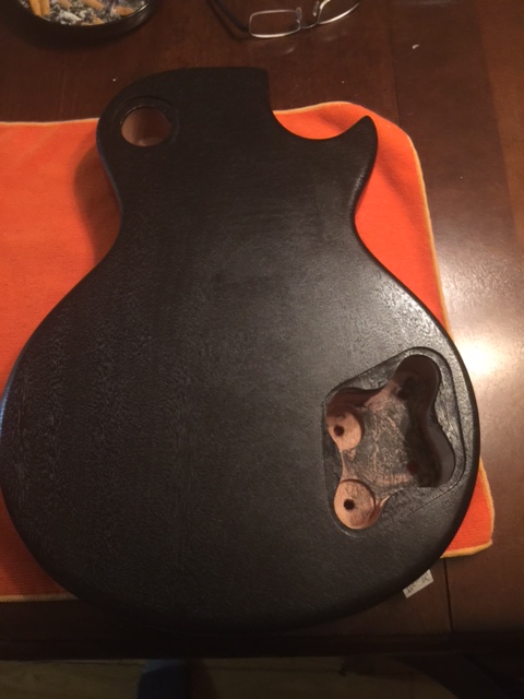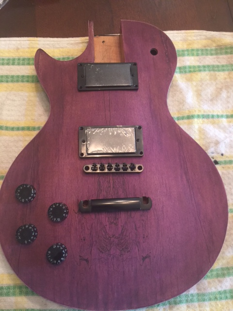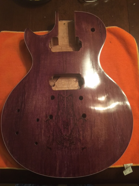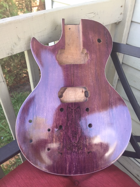 Hi well im waiting on my neck so I decided to dye the body figured if the neck doesnt work out ill hang the guitar on my wall. anyways been dying the body the sanding re dyeing and well im at the point were im adding true oil to it heres a picture of body withought neck and with hard were to see if they fit ok as you can see the purple is flat and you can see the binding on and the secound picture after sanding and dyeing the bacl black and adding true oild im almost there.