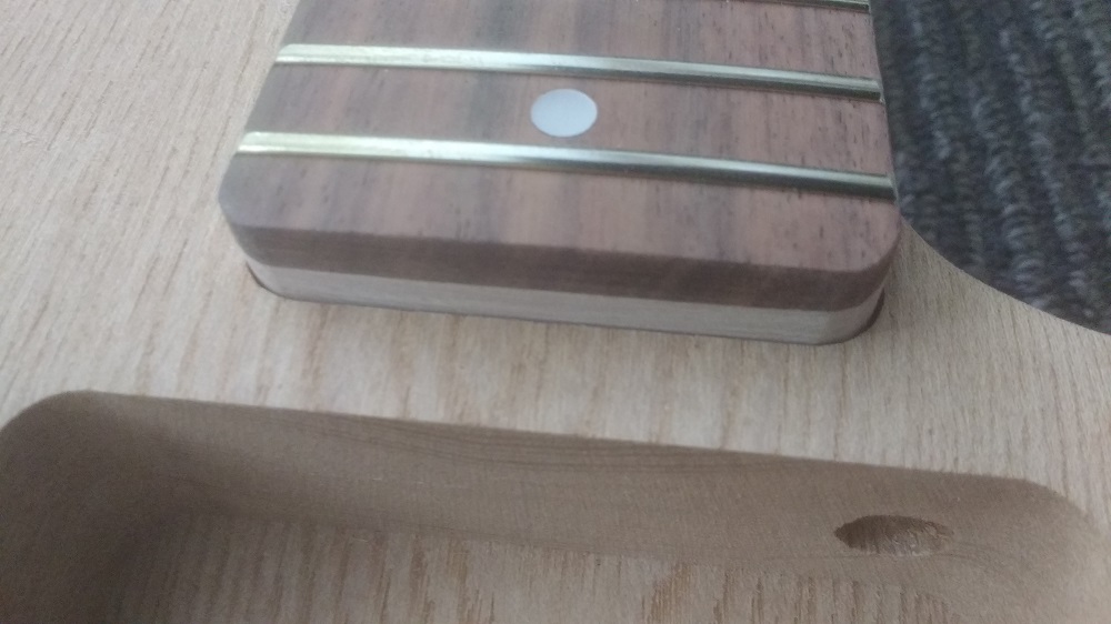 The headstocks have been shaped by the boys at PBG using their Luthier Headstock Shaping service (look under Extras>Services on the website) to my design; not highly original, granted, but I think a nice blend of the two classic Fender shapes. Here's a close up: