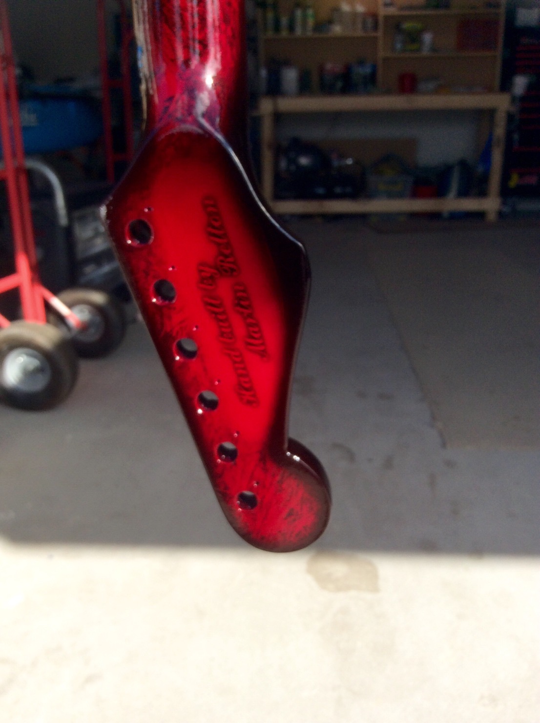 I took the painting handles off to check the colour match between the body and the neck. At this stage before clearcoat I could blow in a little black with an airbrush around the joint to blend them in if there were any problems. Thankfully all's good, the colour was fine, but there now is so much paint on it the neck wouldn't fit in the body socket!