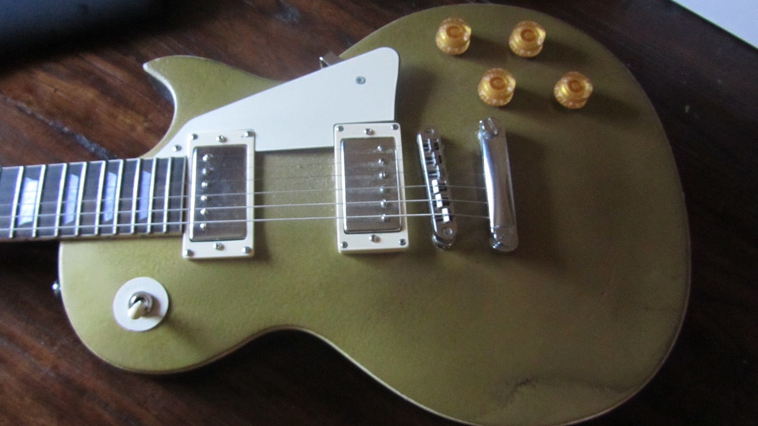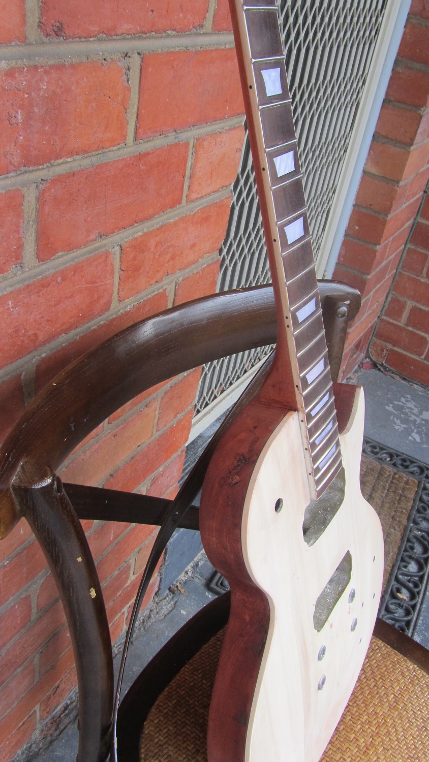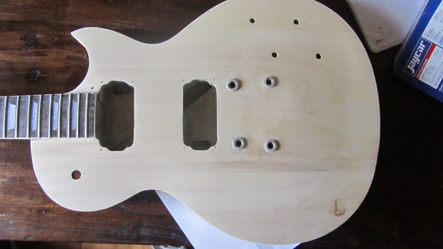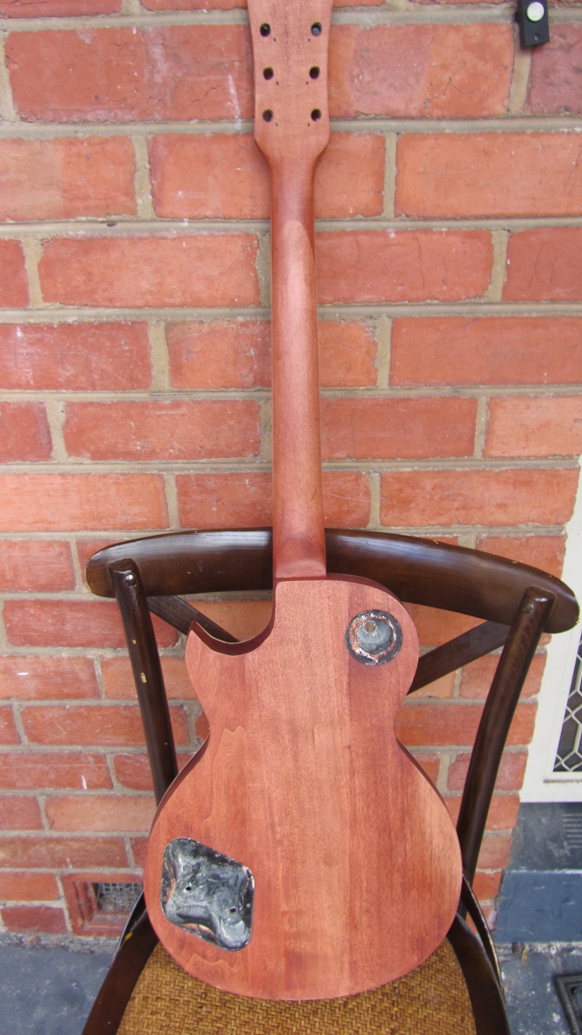 While I wait for my first build to cure, decided to refurbish the first guitar I built from kit. I got it from a music store in Queesldand via Ebay shop..I Wanted a Les Paul with glued in neck and this was below the $150 mark...My budget at the time.Got it last Christmas. PROS...It was cheap..The Neck came pre glued, which I thought it wouldnt, so that was a bonus...All the holes are pre drilled so in one way it is a easier build then PBG..CONS...Body is crap, see photos...3 peice body made from Paulwina...Neck 3 piece...So this can really only be a sprayed job which is fine...