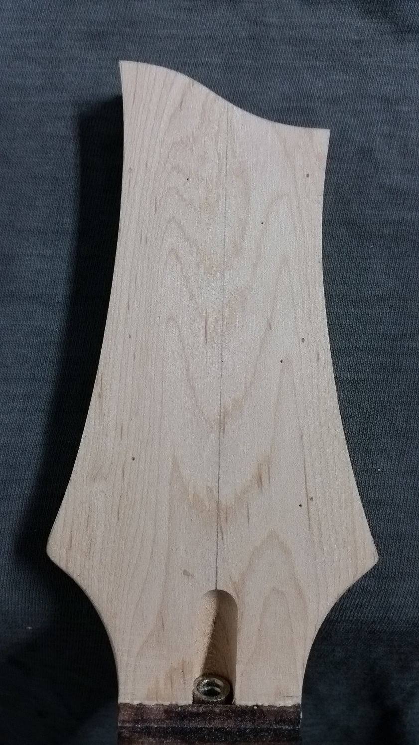 The grain on the head stock seemed to be calling for a PRS style shape and I obliged but with a different profile across the top.