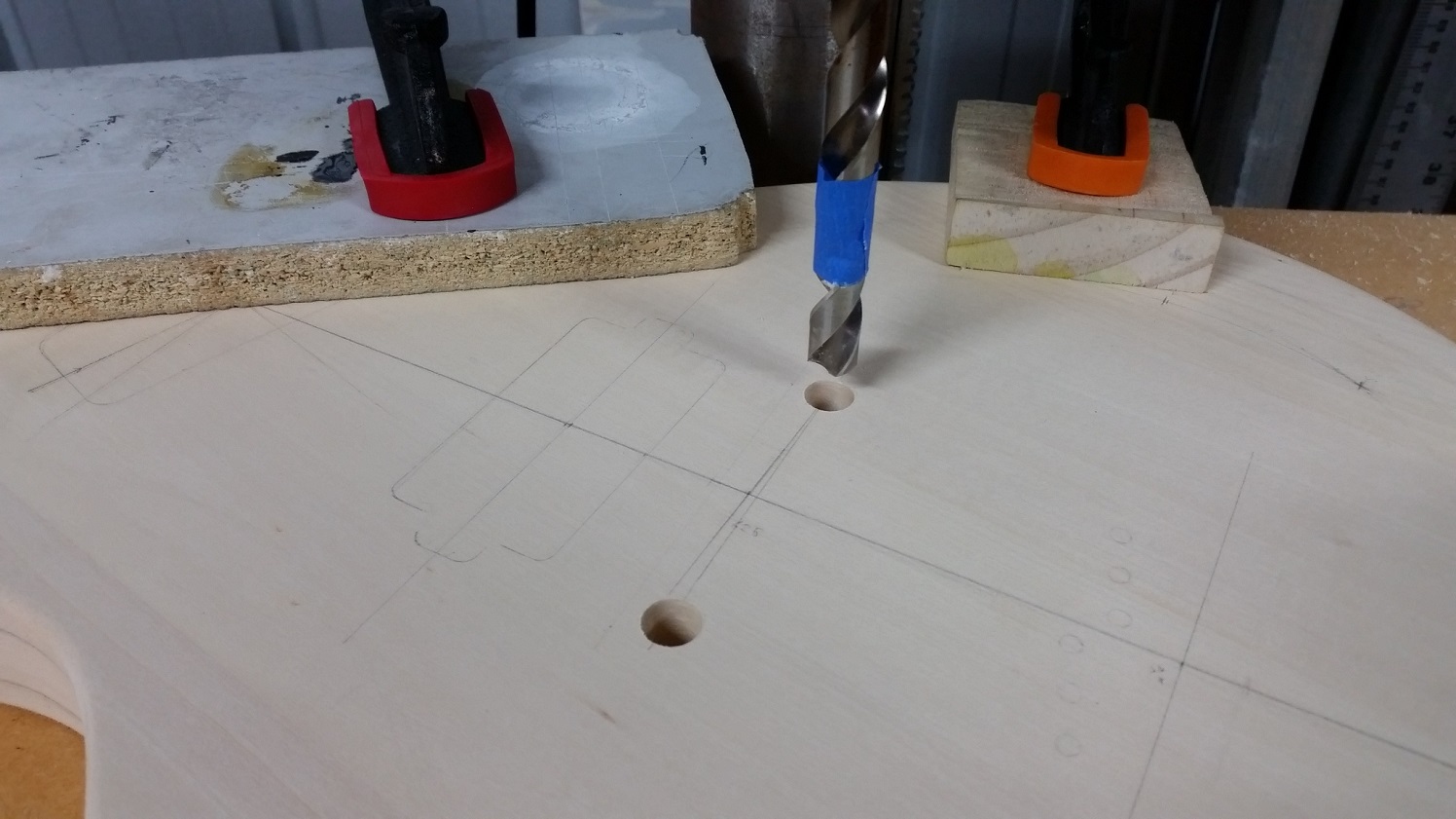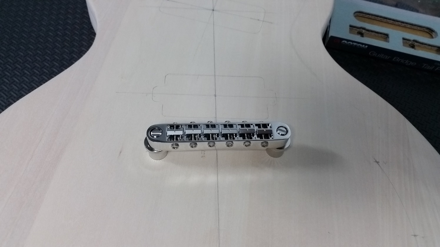 Drilled the bridge bushing holes on the drill press. Original plan was to use a wrap around bridge but they were out of stock when I went to order, which led to another change of plan and went for a Gotoh tuneomatic bridge and string through ferrules. With the fine knurling on the post bushes, found that a 7/16 drill bit gave the right size hole for the smooth part of the bush to slide in and tight enough for the knurls to grab.