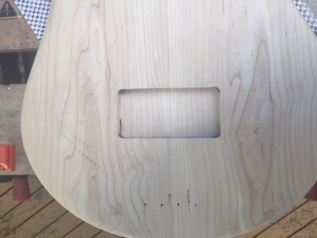 I need to do a bit of fixing around the neck pocket – it’s a fraction wide so I’ll glue in some shims and then sand back to fit but I decided to forge ahead and screw it in place so I could I drill and mount the bridge. I also needed to do a bit of work around the heel to make the shape flow a bit better. With that done I set to routing the pickup cavity. I made a template and measured things up.