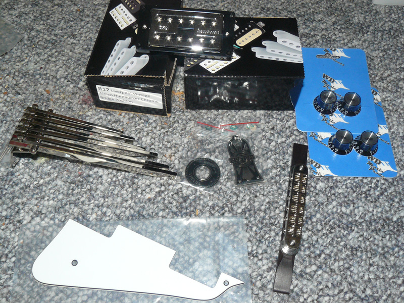 Vintage Liverpool Alnico pick ups from Guitar Fetish, finger tail peice, ebony base and new bridge, fancy truss rod cover and switch surround, white pick guard. Plan is basic black gloss finish as a mate to my Gretch, very Jet inspired, I may add a master volume if it's not difficult to get into the body. Will probably get some more deco style knobs too. I'm planning on doing a headstock inlay of the same design I did on the ES5 but this time in polished stainless steel.