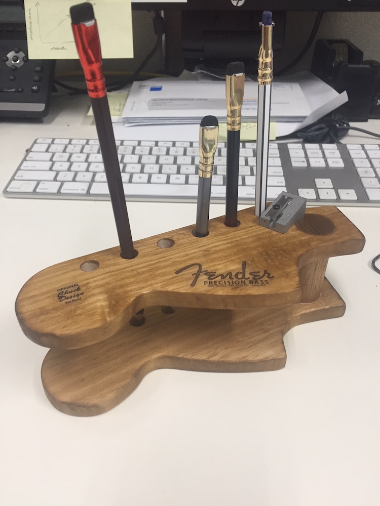 Here's a little something I made last weekend... I've got a thing about pencils so decided to make a guitar influenced pencil stand and here's what I came up with! They are pretty rough - and while I know that using an F logo is frowned upon, I did like the idea of making it seems like I'd chopped the headstocks off a couple of real guitars to make this. In another thread I mentioned I had a bit of left/right mix-up, and this is another. I made three of these and the plan was for the lower "plate" to only be drilled half way through for the support post to sit in. What I only realised after I drilled them all was that I'd drilled them as left handers. Ah well!