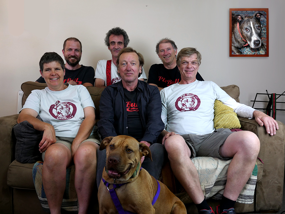 In the photo, left to right, we have Miss Fe, Brendan, Dingobass, myself, Gavin, and Phil. Betsy, the foster dog I can't seem to get rid of, is front and centre and Lucinda, our official Pit Bull Guitars mascot, is watching over us all from the land of 1000 tennis balls.