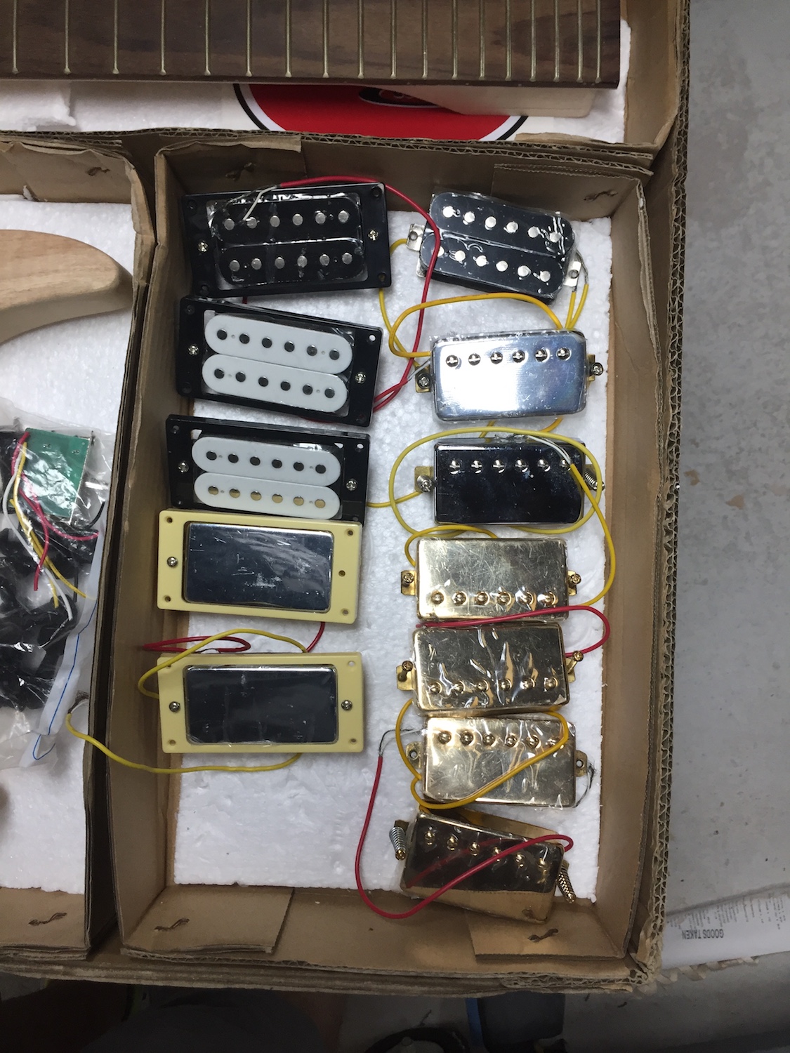 theres 2 sets of Gold LP pups, 2 sets of chrome LP PUPS and a Black set of HB's.