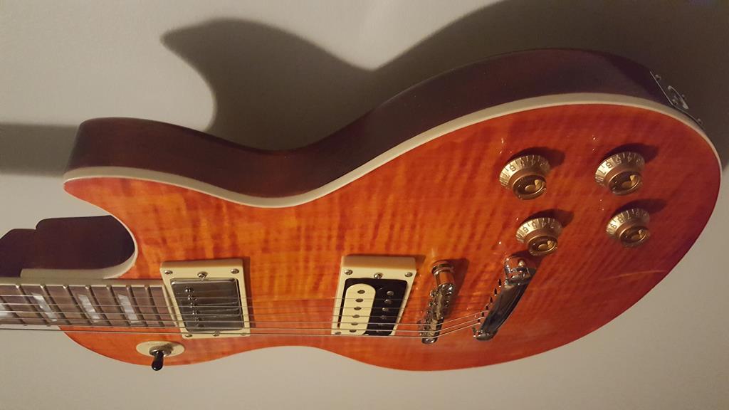 'Les Paul Standard' style kit from DIY Guitar Kits - orange sunburst flame maple top, mismatched chrome/zebra pickups