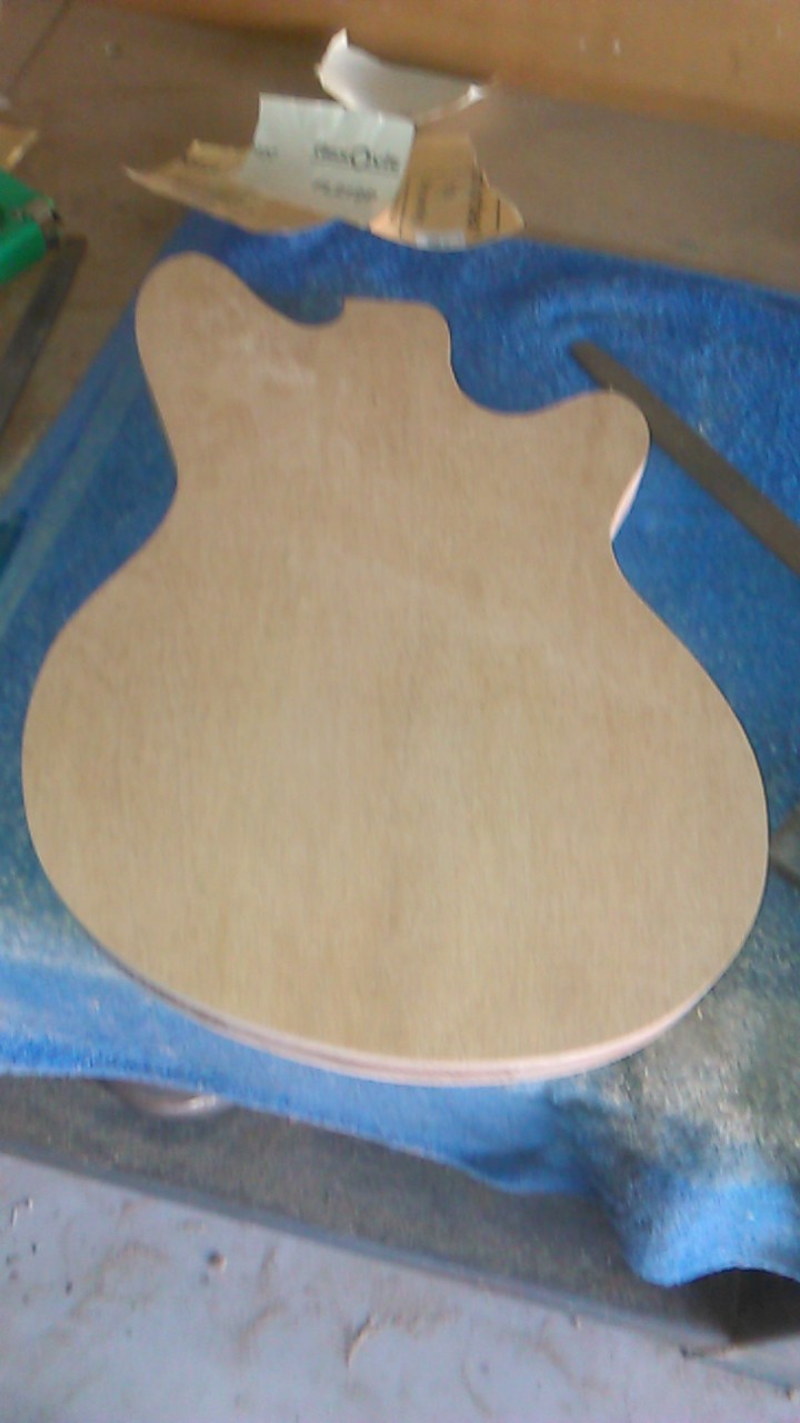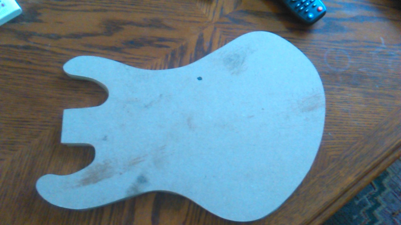 over the past month or two me and dad have been looking at a heap of different custom guitar gear websites and then we decided to make our own. mine is a custom shape which was originally going to be a starcaster shape which was derived from a les paul however it instead turned into something quite different. and dad is doing a roadcore/ jazzmaster shape. at the moment for mine we only have the template jig sawed out and sanded so that there are no bumps on the side.Attachment 18662