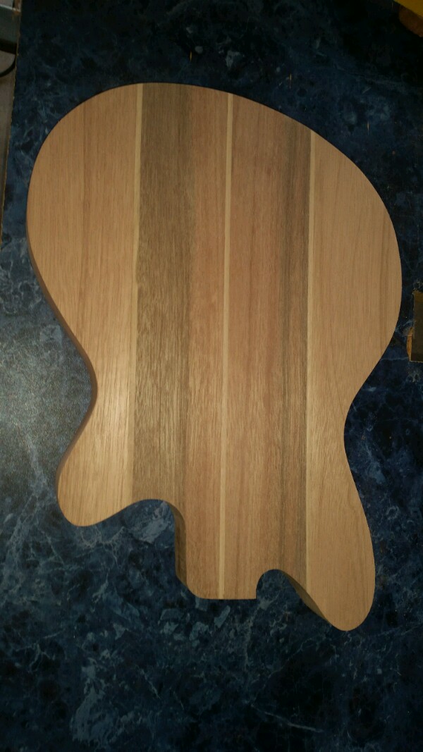 I have been away for a while, I got bored over Christmas and decided to change the look on a sta-1m that I built a couple of years ago. well long story short I enjoyed it so much again that I figured the wife surely wouldn't realise if one or two new guitars made their way slowly into the house ( you know, put it behind the couch for a while and only bring it out when shes not around, after 5 or 6 weeks you can pull it out and say this old thing, nah Ive had it for ages.) Anyway, I've always wanted to do a scratch build, so I started out trying to make a cheap body in case I stuffed it up, I used Tas. Oak as a centre and covered both sides in marine ply. After making a template and routing out the shape I was fairly impressed with the outcome but thought I don't really want a plywood guitar when for a little more effort I could make something much nicer. Anyway I have taken some photos of the body wood as well as the sta-1m.
