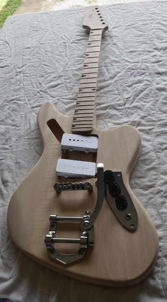 Anyway..... I ordered this as a custom kit last year, Other than the inverted headstock and sharkstooth inlays the obvious bit is the Bigsby. I ordered Grover tuners with it and have set of Jazz master pickups which will require that I open up the rout a little for them to fit. Also got a roller bridge for it. Need to talk to Pabs about a clear pick up guard as I plan to have a design screen printed in reverse onto the back of it as well getting rid of the chrome control panel and combining it into one peice with the pick guard.