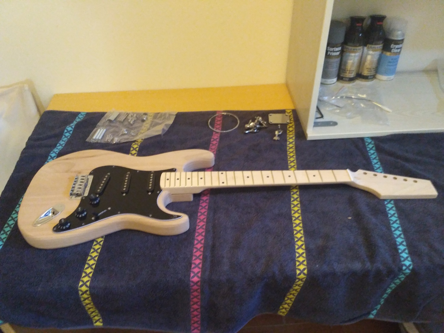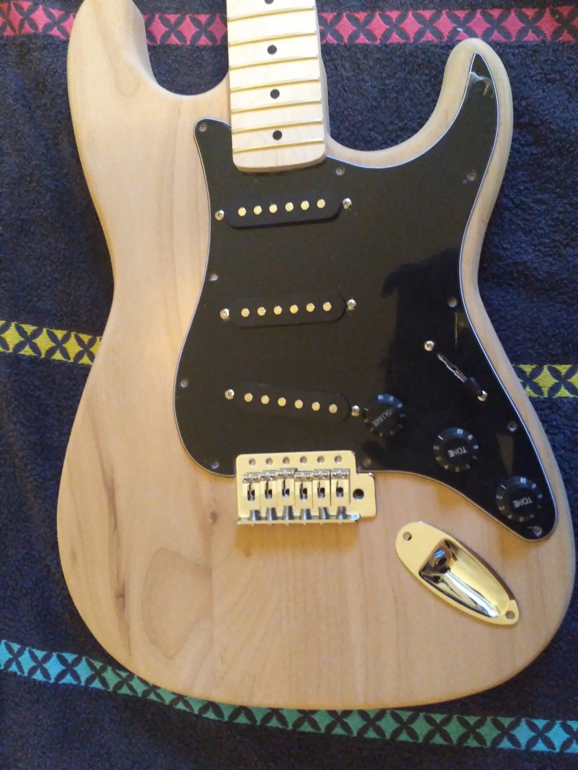 The project is a black strat like Gilmours so the kit came with an alder body and black pickguard and mapple neck and fretboard.