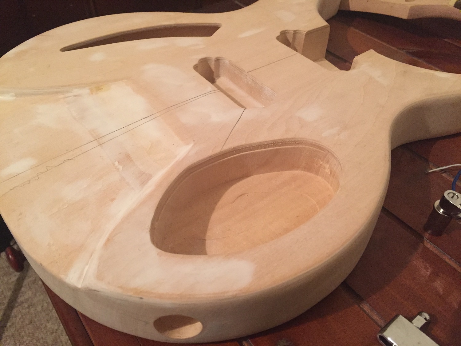 He has done a fair bit of the wiring (which should be decent as he was an electrical engineer) but I'm going to have to drill a few holes for the pickup and input jack wiring as well as some for the bridge. I don't understand why the kit didn't come with these pre-drilled.