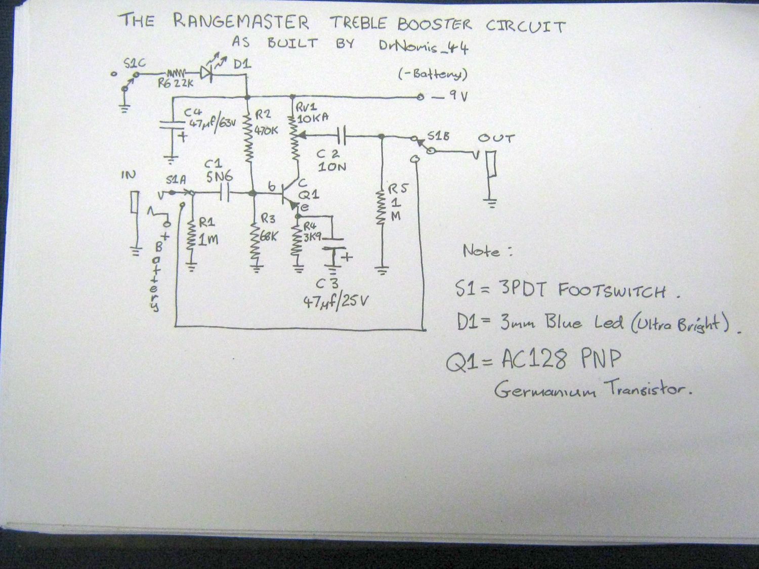 And here's the actual circuit diagram for my Rangemaster pedal, as I built it:
