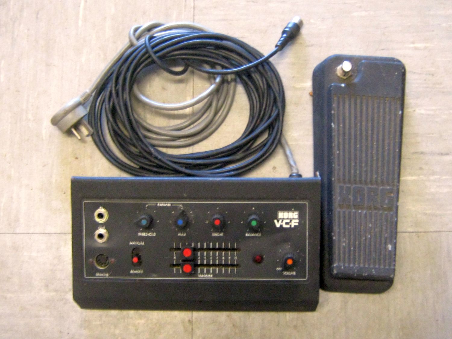 For those of you wondering what VCF stands for, it stands for Voltage Controlled Filter, a VCF is basically a filter that has a voltage-controllable cutoff-point, the cutoff-point of a filter is the point at which a signal's loudness falls to about -3Db (sorry for the technical terms), so the higher the control-voltage you feed into it, the higher the filter's cutoff-point will be, a filter is an electronic circuit that lets some signal-frequencies through and stops others, the tone controls found on electric guitars is an example of a filter, voltage-controlled filters were one of the essential modules found in Analogue Modular Synthesizers, like the Moog Modular Synthesizer, the Voltage Controlled Filter was used most often to shape the timbre, or tonal-colour of a sound generated electronically by a Synthesizer, if you feed a signal from a guitar into the Korg FK1 VCF you can change the tonal-colour of the guitar from bright to dull, or anywhere in between, it can be used as an auto-wah pedal, it will react to how hard or softly you pluck the strings, or, you can use the footswitch to control it, or you can even control it both manually and automatically at the same time, if you feed the output of the Korg FK 1 VCF through a chorus, delay, and reverb pedal you can get some very spaced-out sounds.