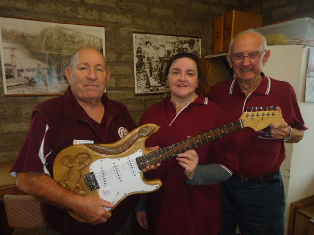 “Every year Shellharbour Woodcarvers donate a Carving to the local Hospital for their Christmas Raffle to raise funds. This year we decided on a Carved Guitar, purchased from Pit Bull Guitars. One member, Frank O’Connor carved a Goanna and a Snake on the body, Alyssa Willstrop did the Pyrography on both, Kevin Gillis did the final touches, French Polishing, it has turned out excellent. Frank and another member, Jim Balmain put forward the idea as a way of donating our yearly Carving, and also as members have Grand-children, they may want to do one for them. The body is Basswood which was very good to carve.”