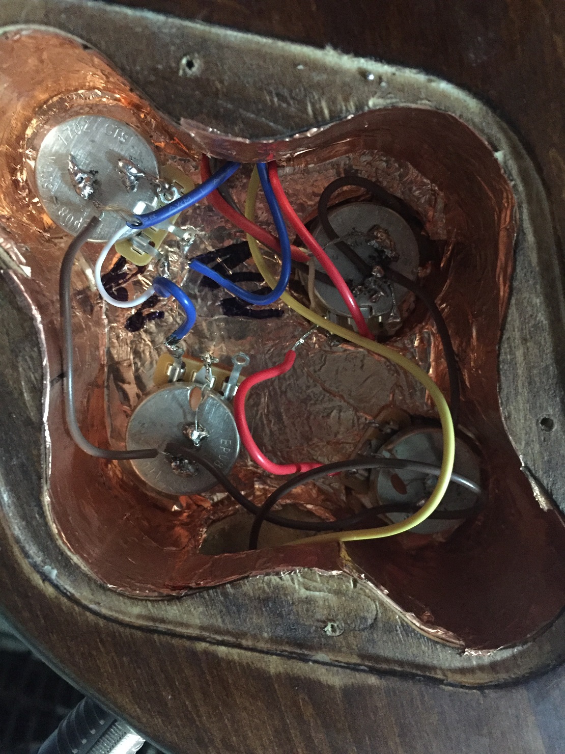 2. From what I can see, the ground wire from the jack loops out over the neck tone pot (can't see if there's a break in the insulation and it's soldered to the back of the pot but I'm assuming not) then hits the back of the bridge tone pot, then runs to the bridge vol pot. Looks like three ground wires on the back of the neck vol pot, but I can only see where two of them go (unless one is the bridge grounding wire). So unless the jack ground goes first to the neck tone pot, there is no obvious ground link to the neck volume and tone pots except via the copper shielding. I'd add a ground link between the two tone pots.