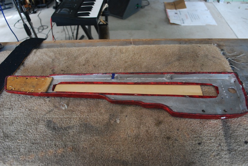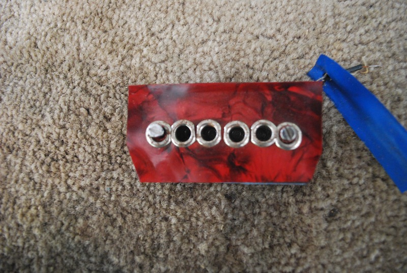 The pickup from above. Fully handmade by a Taihape panelbeater called Bunny Milne. The pole pieces go through the coil and screw into the body through a sole plate which is insulated...