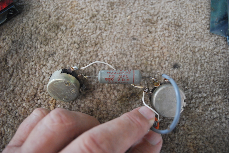 The loom. Huge great British pots which are a little scratchy but otherwise fine with an enormous capacitor. I think I may leave this loom out and build one with modern components, just for sh1ts and giggles! Both of those pots, by the way, are log taper...