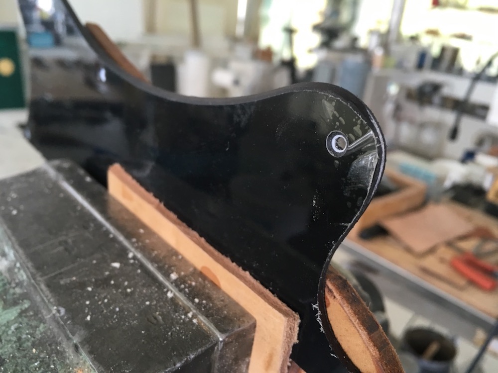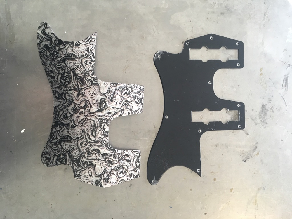 Here we have the pickguard. I tried different approaches to the smoothing the bevel and got varying results. The white layer made the unevenness stick out like a sore thumb. I decided on a classic solution; black marker. This is regular marker, later I went over it with a proper acrylic paint marker. Looks good to me.