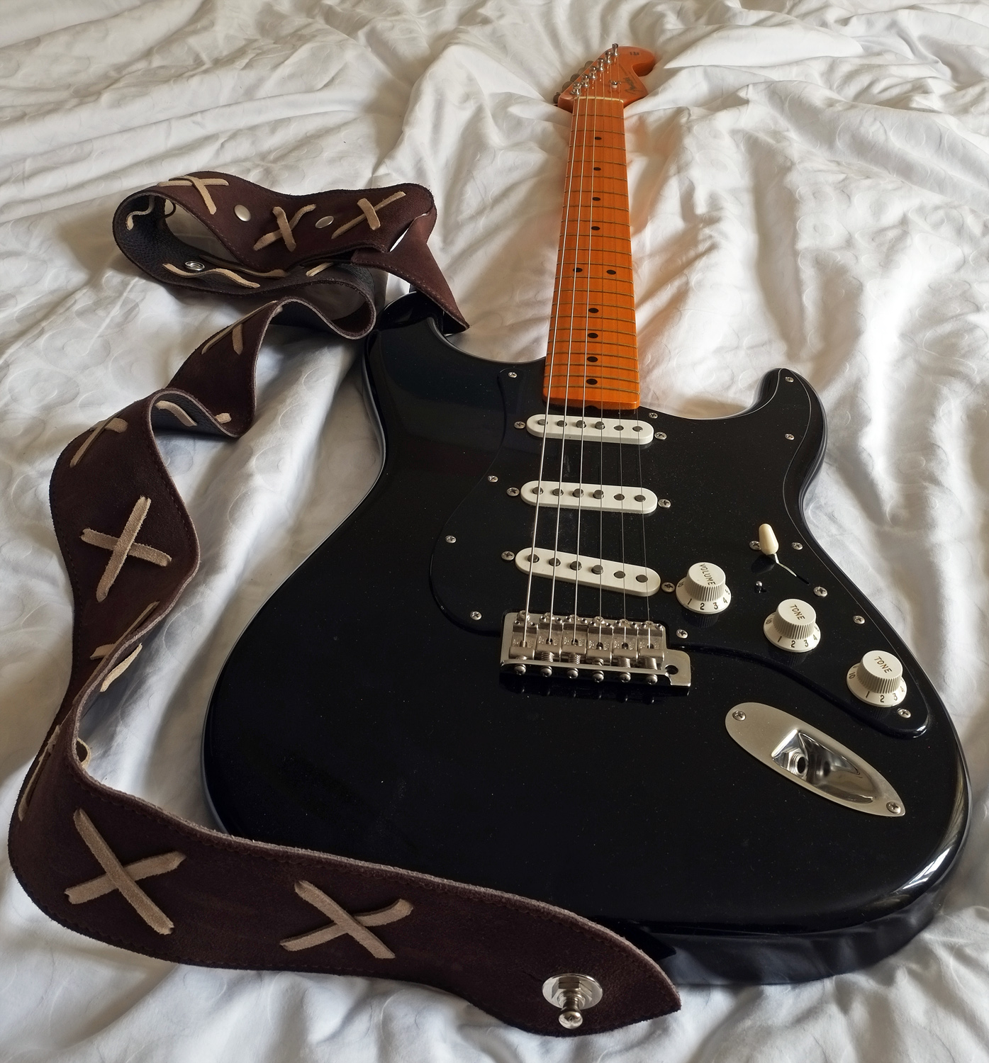 Here's my Fender CS David Gilmour NOS Black Strat, complete with look-alike strap. It really is a very nice guitar. 50th Birthday present back in 2000 from my wife, who really is a very nice wife.