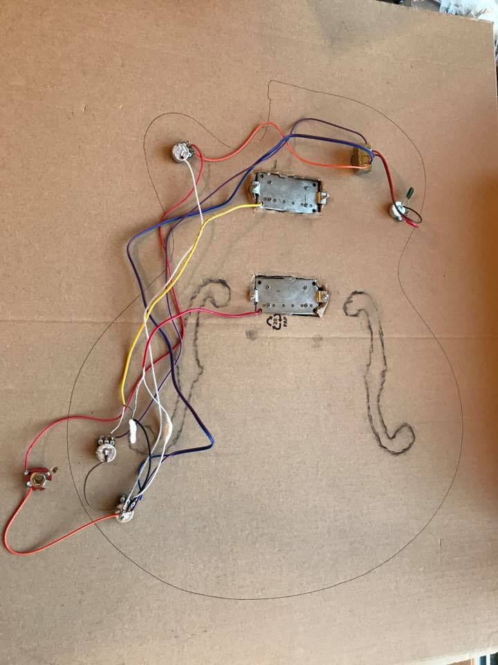 Getting the electronics ready. I used some vellum and a HB graphite pencil to make a rubbing, then created a cardboard template to assemble the loom. I used the alternate tone wiring scheme found here. Although I was too lazy to do the ground jump on the third pin of the pots (we'll see if I live to regret that.) I've plugged it in to my amp, tapped the pickups with a file, and everything works! No hums or buzzes either. It's been a long time since if done any soldering, but it all came back to me. I used to solder my own MIDI cables because I liked to have custom lengths, so this was familiar to me. Next step is the finishing. I'm going for natural with Tru Oil. Depending on the drying time, I might be finished by the end of the week!