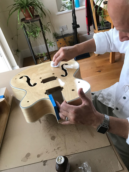 In the final stages of finishing. I'm amazed and pleased at the results I'm getting from Tru Oil. The neck is finished in just three coats. I've done four on the body and will decide tomorrow after 24 hours of drying if I need any more.