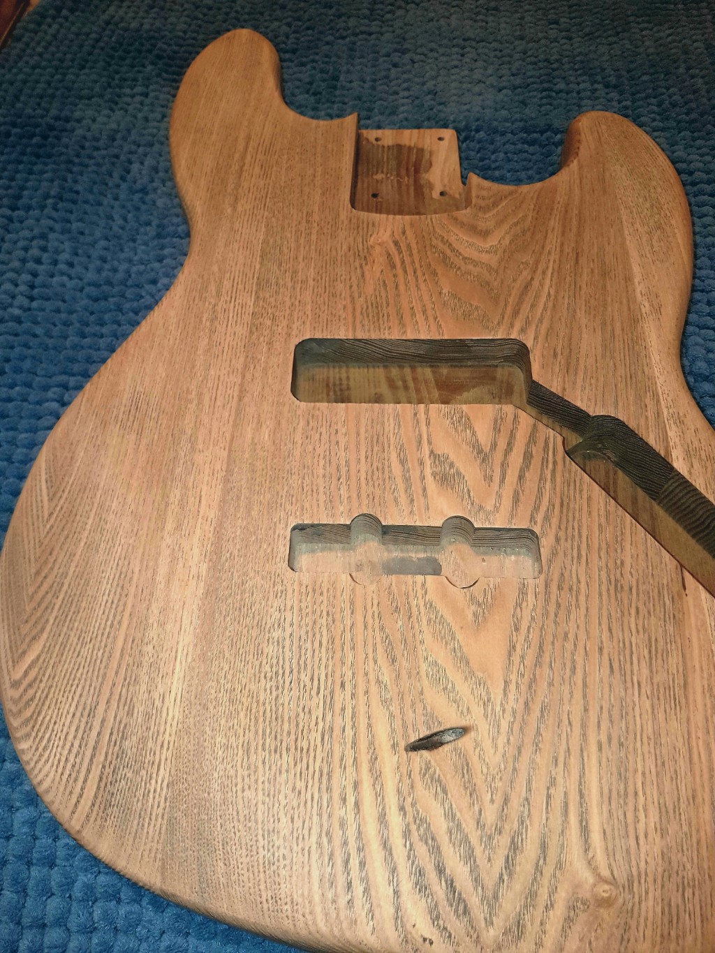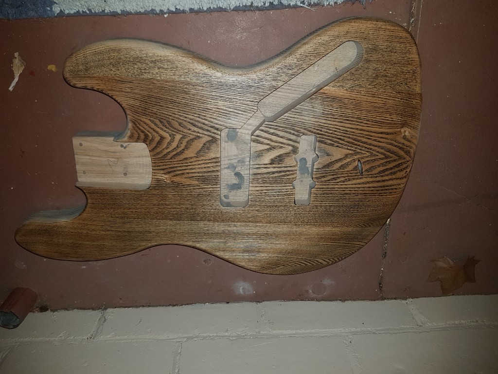 Mineral turps reveal following grain fill and sanding with 80Grit. Hmmm ... looks like an old oak church pew. Lovely - but not what I want. Thinking I will ebonise wood with steel wool and vinegar solution, buy a red pickguard and do something like a Wilko Johnson black-n-red Fender tribute (albeit a bass version).