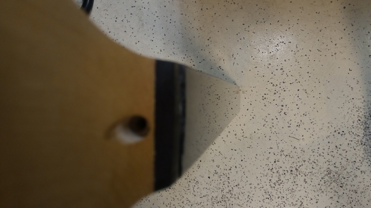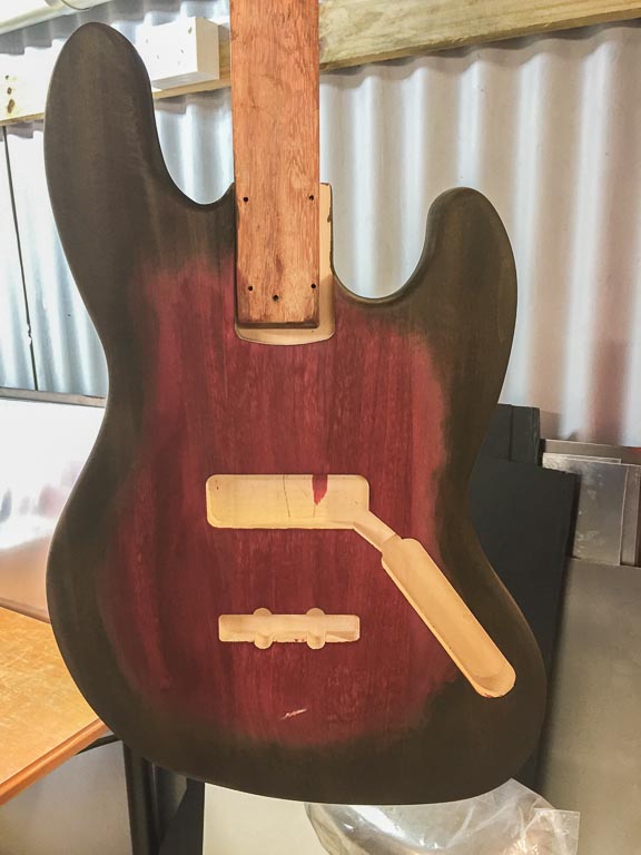 I decided (bravely?) to try a challenging burst by hand. Red mahogany in the centre and a semi-dark black on the outside. I started by sanding for a few days. I never knew 320 and 400 grit for timber even existed before this project, although I've done mirror finish on steel by hand several times, most recently on an anvil of all things. Hey, don't get any fingerprints on my anvil! Anyways, I practiced with the stain on hardwood ply a few times before tackling the guitar. I found that with a mix of 1 part stain and 2 parts colour reducer you can actually move the location and blend of the burst with a reasonable amount of control. The mix of the black and mahogany even turned out to be a pleasant walnut brown colour. What I couldn't control at all was the parts of the timber that were too thirsty for the stain. These just stayed whatever colour you first applied. Overall, I think the final result is ok. Even if I just went with a single colour it would still look patchy because of the thirsty bits.