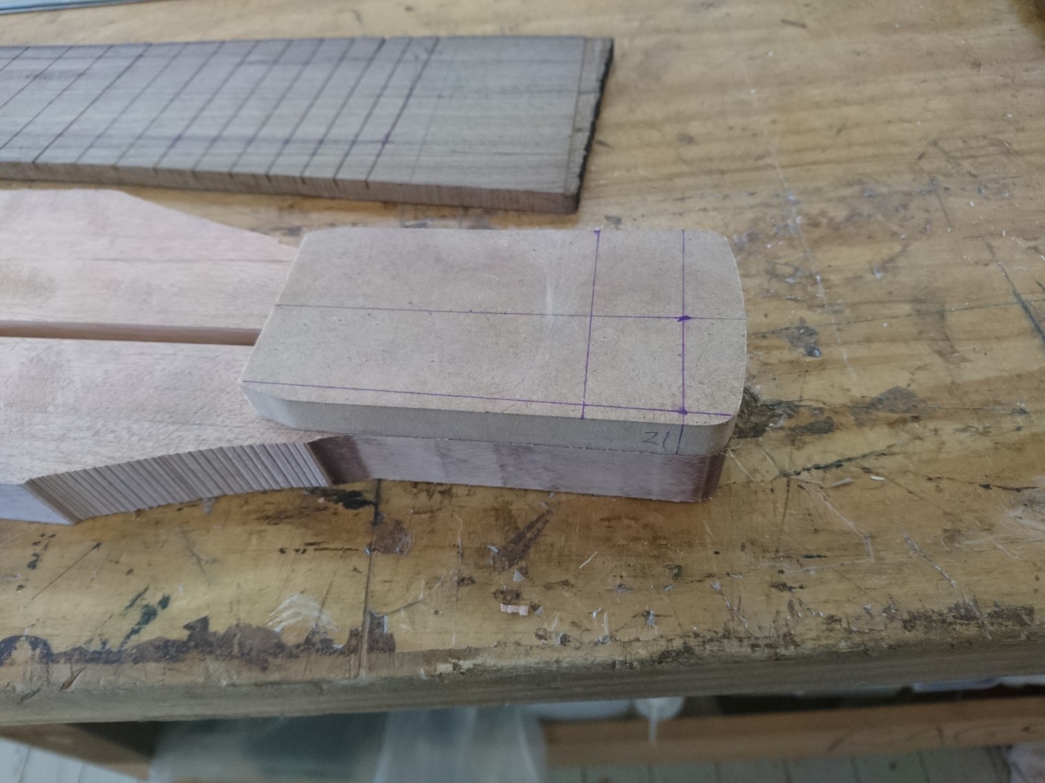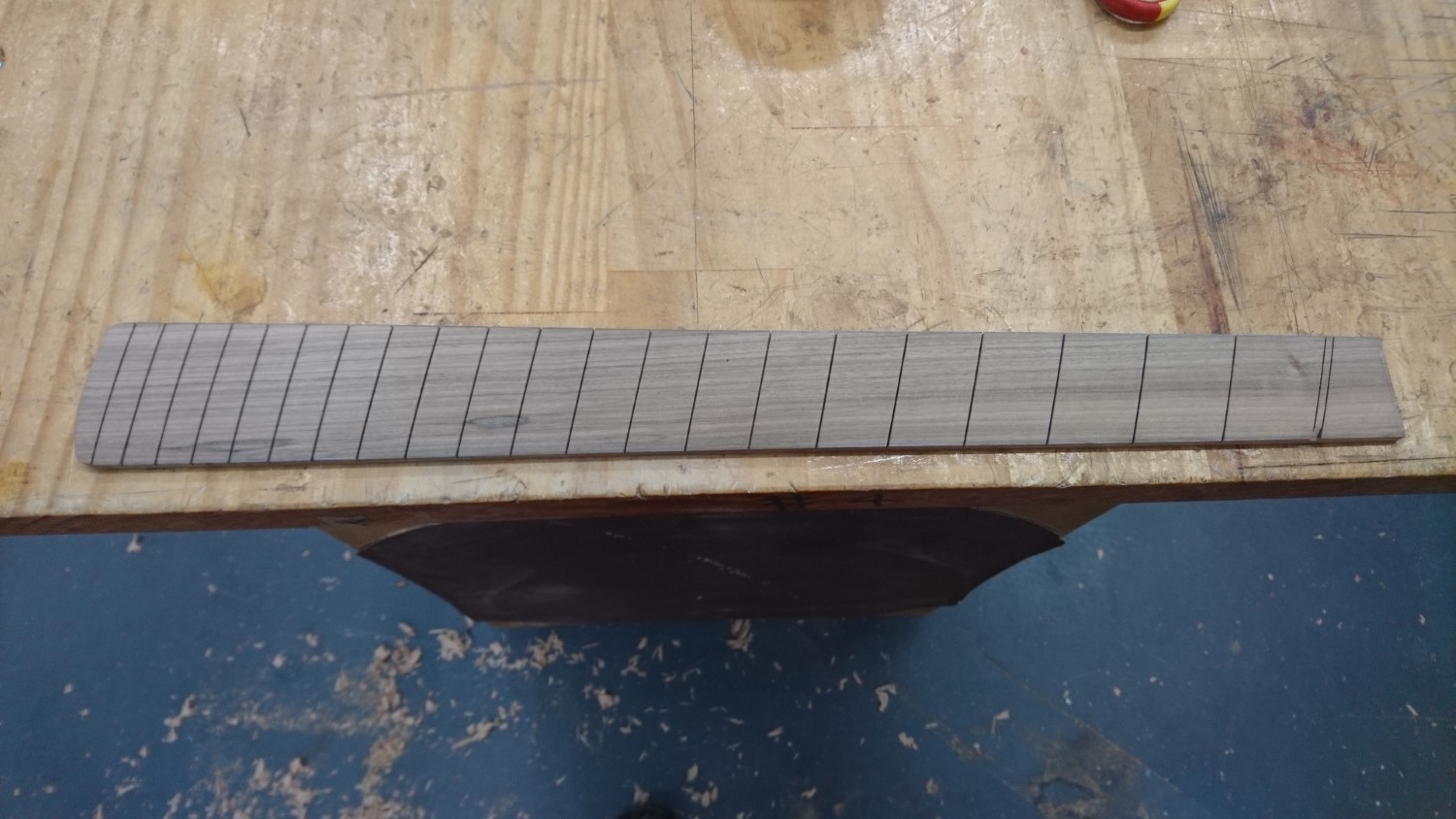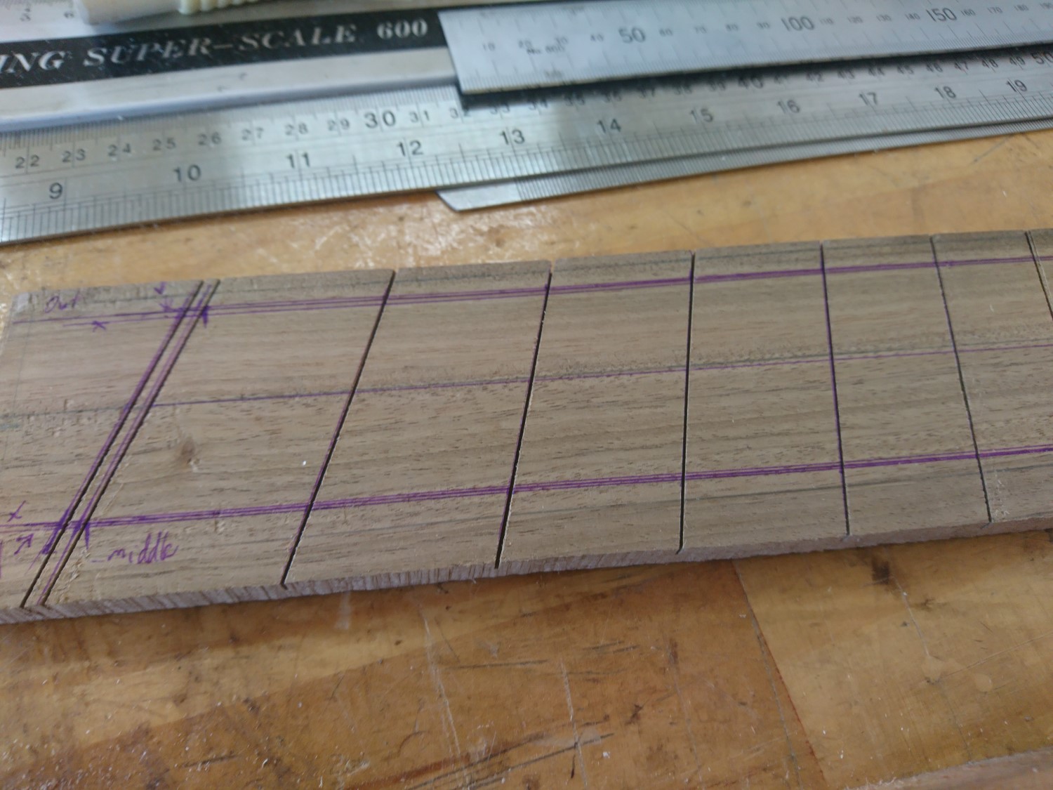 Then prep'd the fretboard to be cut. Again it's pretty straight forward so far, just planed down one edge to flat to keep it solid in the slotting jig next week. This time though I've drawn the lines on the wood itself instead of gluing on the fretboard template. We'll score the lines in before cutting it just to make sure it's all nice and easy.