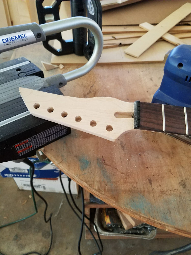 Thoughts from the mock build: More concerns with this one. There's a good bit of play in the neck pocket, so I'm going to have to be careful with that to get the neck straight and probably use some shims on the sides. That gives me a little heartburn, as I'm already nervous about drilling the necks on both of these. The neck on this one is also comfortable, but in rougher shape than the MM-1 neck -- lots of uneven frets and sharp edges, so definitely a full fret level and dress needed. I also have some concerns about cutting out the paddle headstock. Don't want to screw it up. Tuners actually feel a little better than the MM-1s, but still not great.
