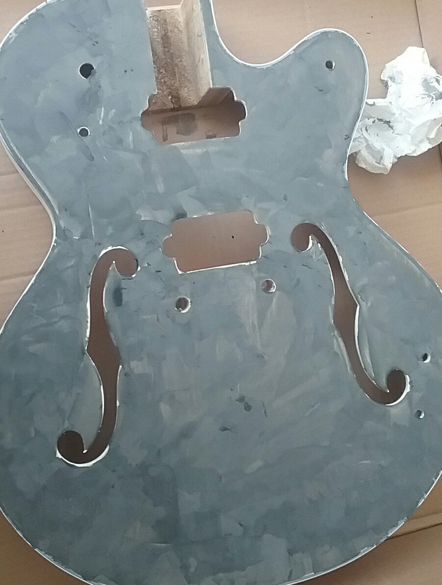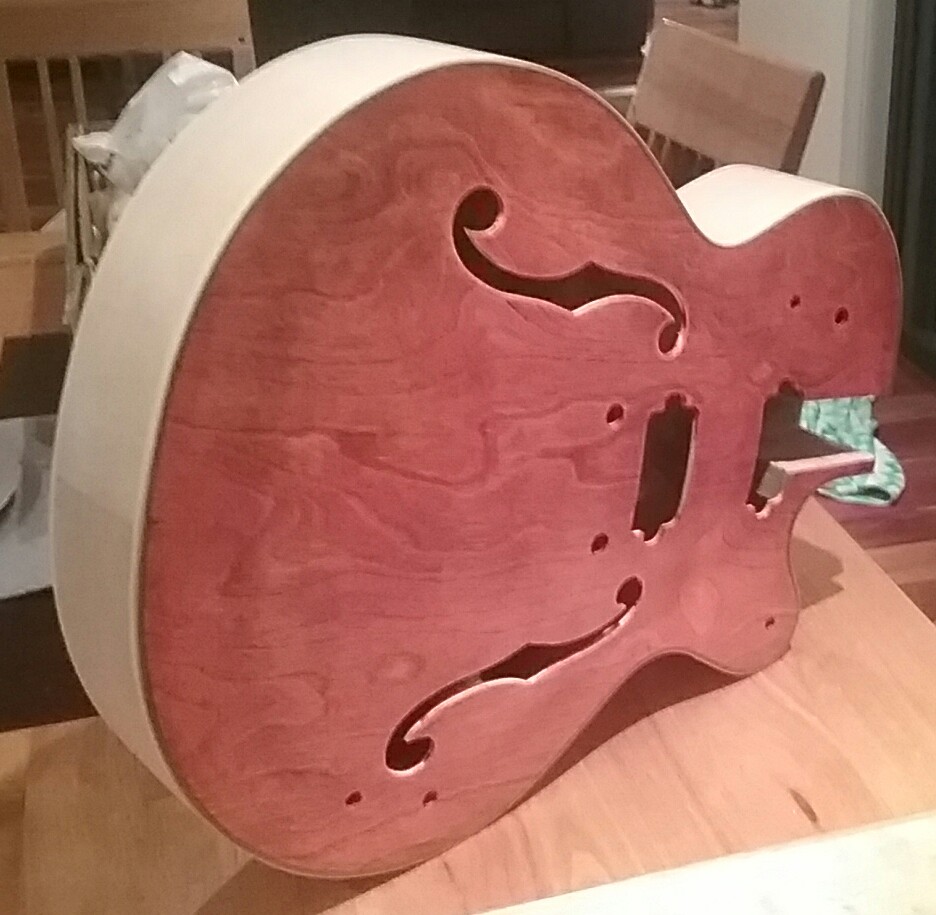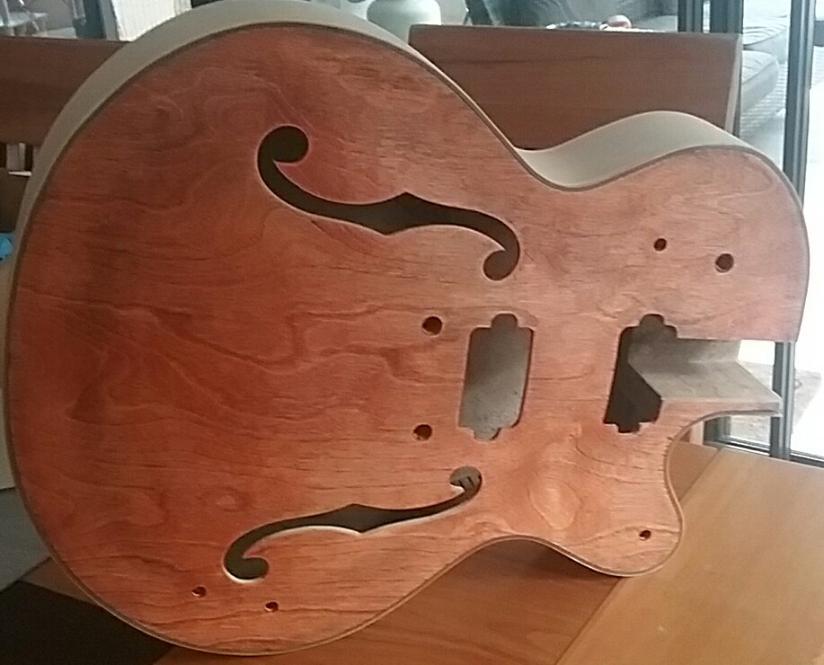 I strongly suspect this is an issue because of the particular guitar design we are trying to finish,[Hollow -semi hollow body] if it were a Strat or Tele, or any other Solid Bodied guitar, the problem of darker areas in the concave sections [ left & right cutout areas, both middle bought's ] wouldn't be a problem