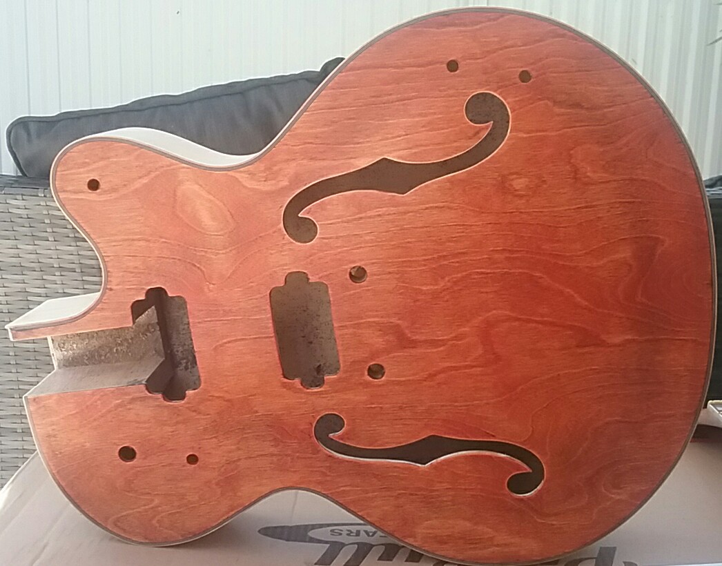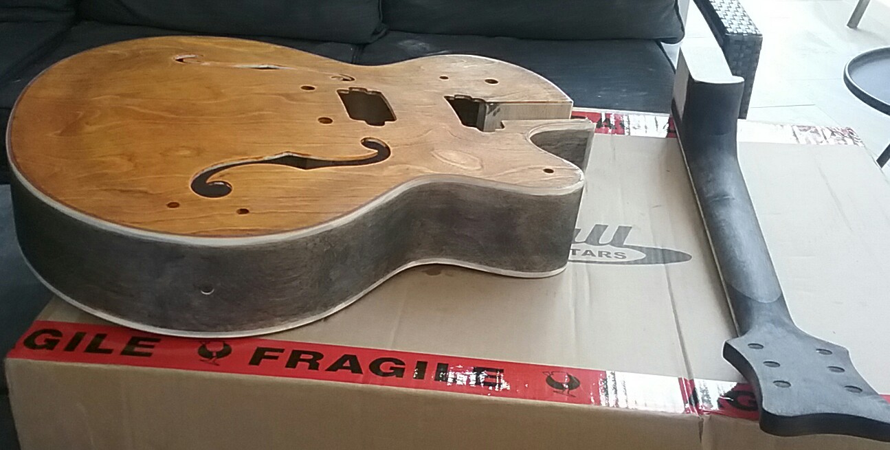 Attachment 23023Attachment 23024Attachment 23025Attachment 23026Attachment 23027im a sucker for hollow bodies.The new project turned up this week, thanks adam. Ebony timbermate the top, back and headstock today, the plan is to use DT bushfire sunrise on the top and back and leave the neck and sides clear