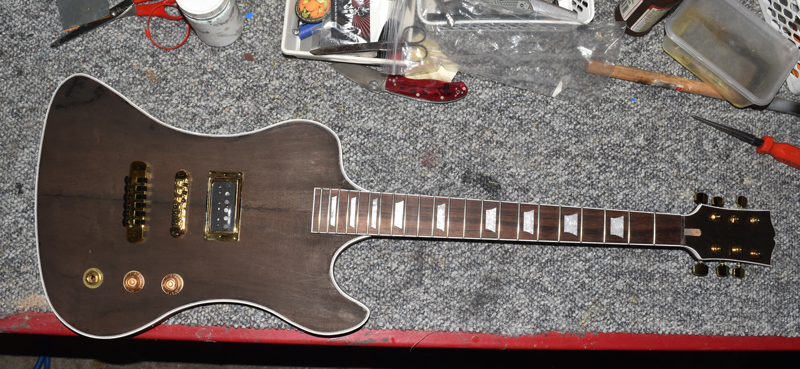 mock build, still need to make a control cavity cover from brass, truss rod cover from brass,the actual tuners I'm using are still coming, the ones in the pic are some Chinese ones I hads same with the control knobs, some gold ones coming. Need to fit the nut before glueing the neck in. The some clear , some wiring and some playing :D