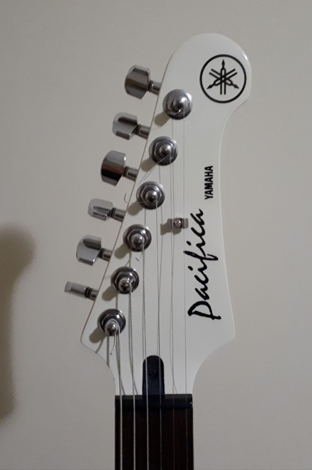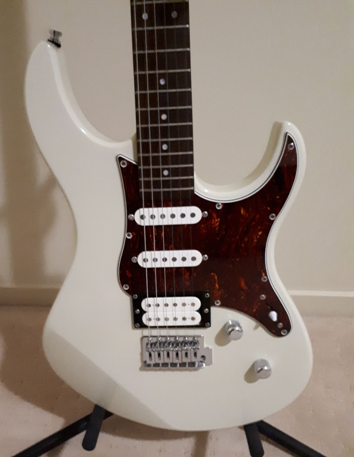This is a lovely example of the QC that Yamaha has across all its factories. Indonesia was where this one was born and comes in Antique Vintage White with Tortoise Scratch Plate.